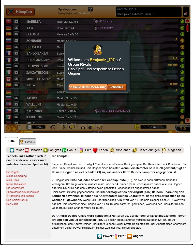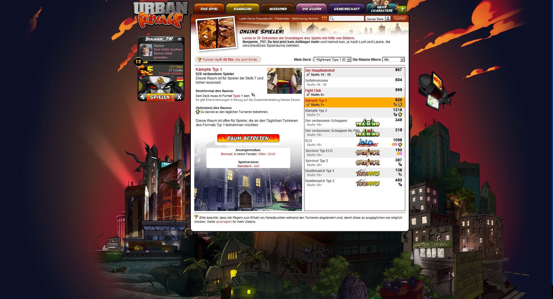 Zuerst wähle ich einen Raum aus. Ich wähle "Kämpfe Typ 1" aus dem Grund, weil alle Duelle in diesem Raum zur Turnierwertung zählen. Die Gegner sind dort auf allen Stufen vertreten... Es gibt Räume für Typ 1 und Typ 2 sowie welche, die nach Stufe begrenzt sind, in zweiteren zählen die Duelle aber nicht für Turniere. Da ich den Anfängerstatus schon hinter mir habe, ist der Unterschied nicht sonderlich groß.