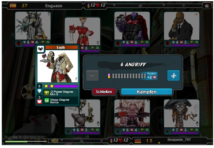 Auf jeden Fall beginnt der Spanier das Duell mit der Frau in rot, was ich mit Eadth kontere (ich spiele übrigens ein reines Untotendeck). Ich setze 0 Pillen, da ich mit einem Bluff rechne und davon ausgehe, dass der Spanier auch keine Pillen einsetzt.