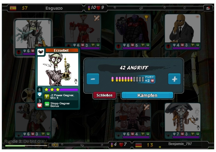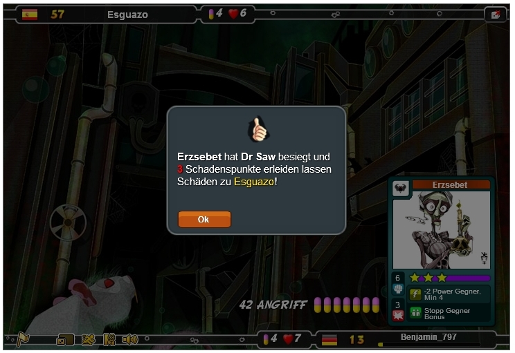 Mein Gegner ist ein Spanier auf Level 57. Aha. Wie man sieht, wird das Spiel weltweit gespielt.