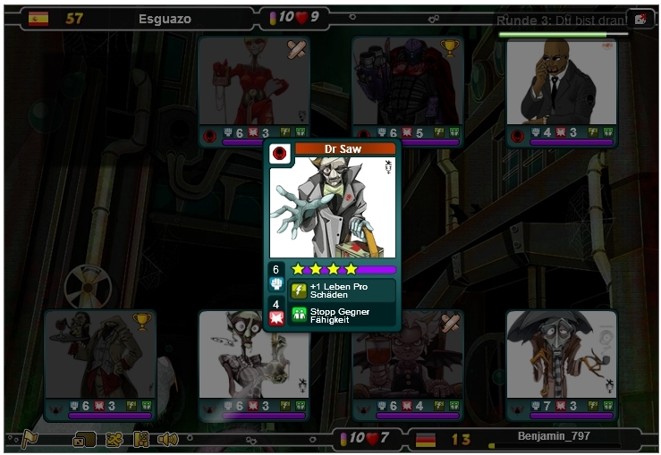 Wie man sieht, war meine Investition vergebens. Mein Gegner spielt so einen fetten Schrank, der dank Pilleneinsatz (2 Stück) den Orlok zerlegt und mir 5 Schadenspunkte reinzieht. Jetzt haben beide noch 10 Pillen auf Reserve. Mein Gegner spielt darauf Dr. Saw, der seinen Lebensvorrat auffüllt, wenn er das Duell gewinnt und mir dadurch Schaden zufügt.