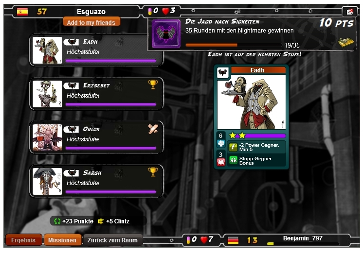 Damit habe ich das Duell (irgendwie) gewonnen. Rechts oben sieht man, dass ich dadurch auch an einem "Achievement" arbeite. Davon gibt es dutzende, mit denen man sich jahrelang (?) beschäftigen kann. Allein für jede Gruppierung (Bangers, Untote, etc) gibt es ein Achievement, wenn man Duelle mit mindestens 2 solcher Helden auf dem Tisch gewinnt. Das Achievement (in dem Spiel übrigens Missionen genannt) ist für die "epische Quest", bei der man eine seltene Karte gewinnen kann, wenn man 4 bestimmte Missionen erfüllt.