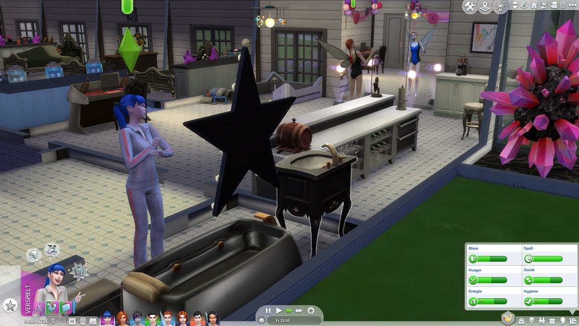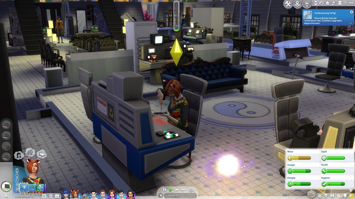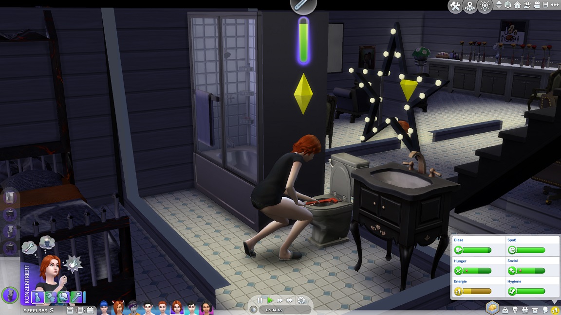Erin pumpt Charisma. Annika muss für die nächste Beförderung ebenfalls Charisma pumpen und weicht auf die Toilette aus.