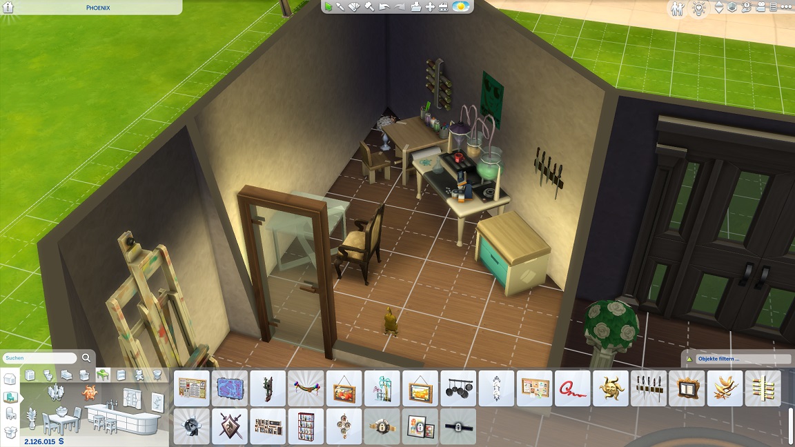 ... entschließt sie, dies lieber in das Spielzimmer zu tragen, was die Leinwandstapel leider durch passenden Wandschmuck ersetzt.