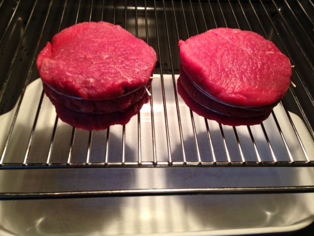 Ofen auf 55°C "vorgeheizt". Ober- und Unterhitze, Umluft finde ich da nicht so empfehlenswert. Da die Regleranzeige für den Ofen mit der tatsächlichen Temperatur nichts gemein hat, empfiehlt es sich, die Temperatur mit einem Ofenthermometer zu kontrollieren. Wenn mein Regler auf 75°C steht, habe ich drinnen echte 55°C. Über die Temperatur kann man dann auch die Garstufe regulieren, wer es englisch mag, geht eher auf 45°C. Das Fleisch unbehandelt aufs Rost legen.