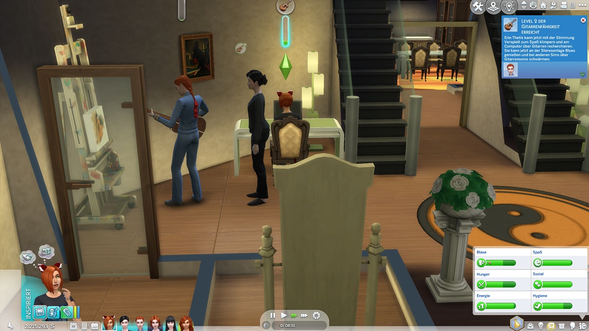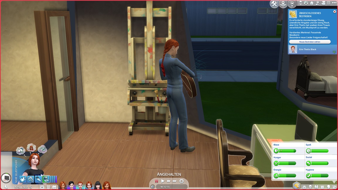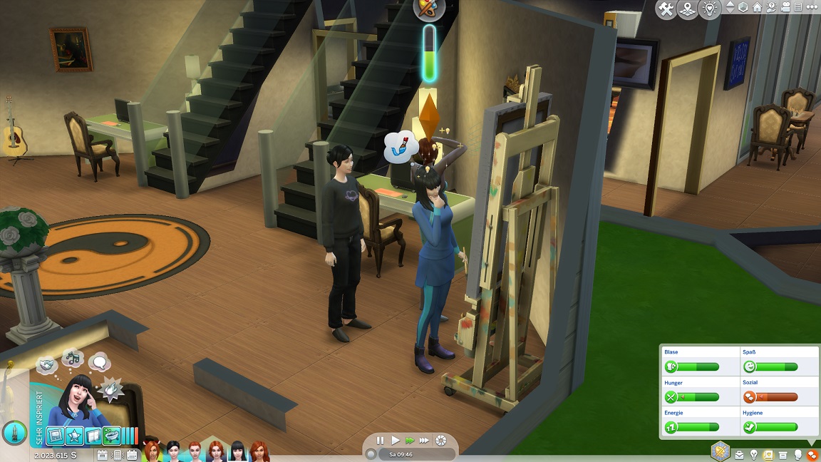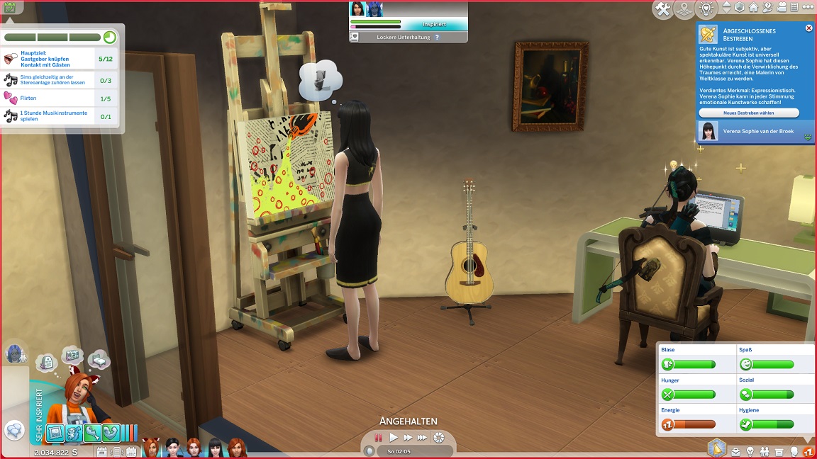 ... testet einmal die Gesamteinnahmen aus und wendet sich nach diesem Ego-Dämpfer der Malerei zu. Die kumulierten Boni aus Unterricht, Vorteilen und Raum-Aura schlagen dermaßen ein, dass sie bereits mit dem ersten Bild sechseinhalb Fertigkeitenstufen erlangt.