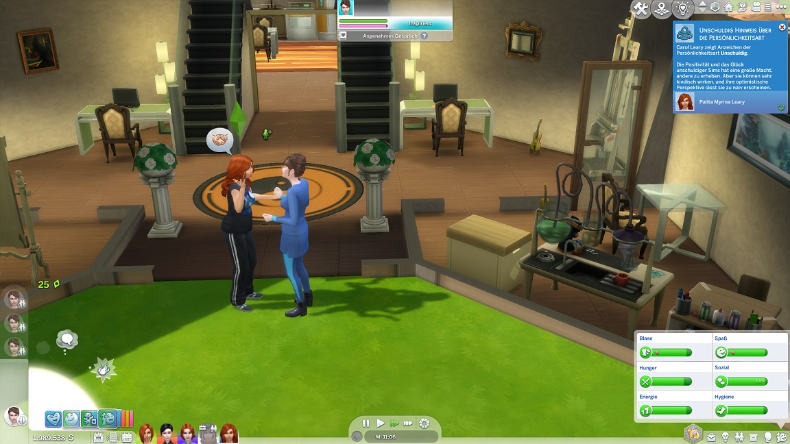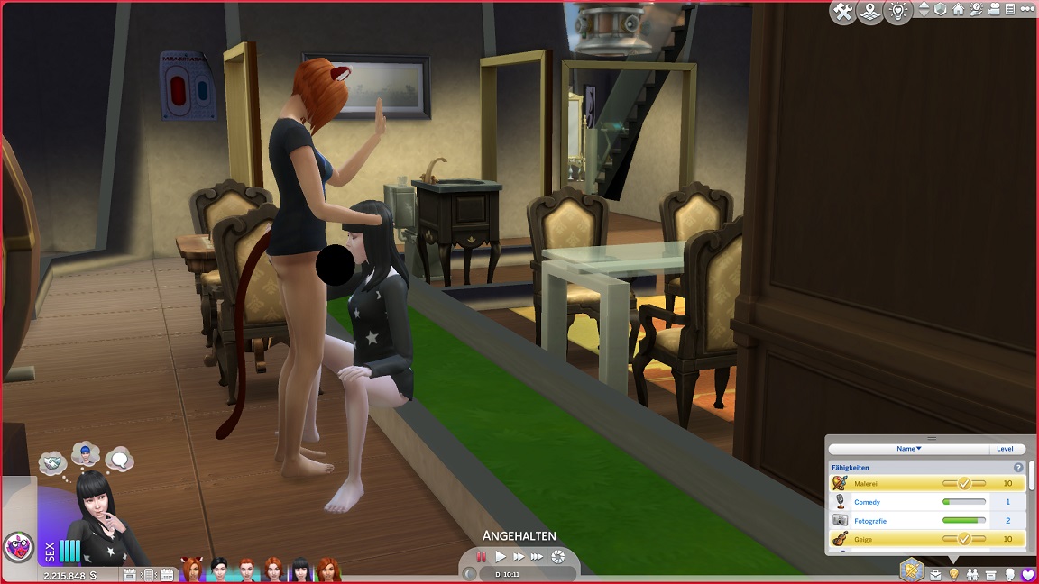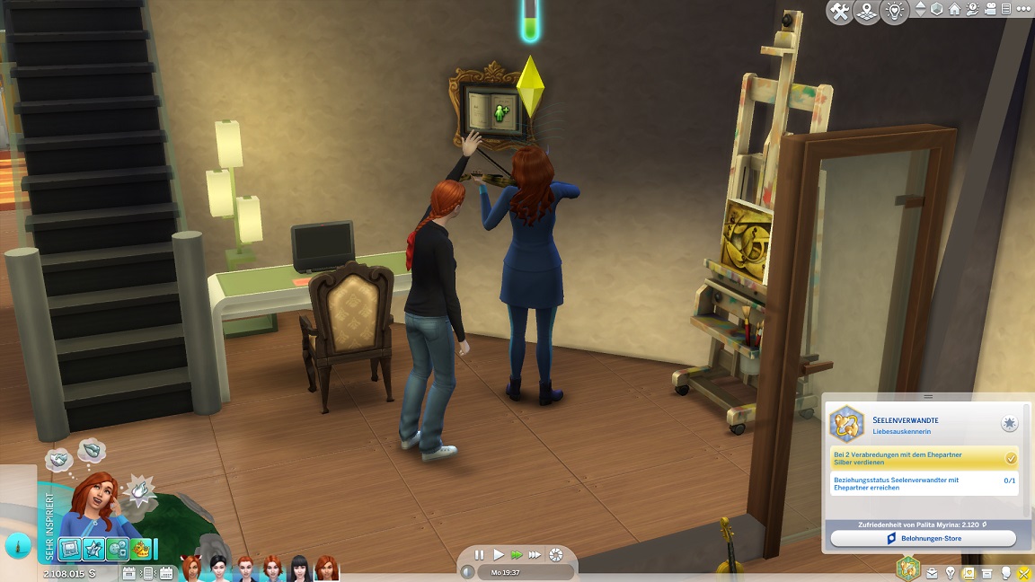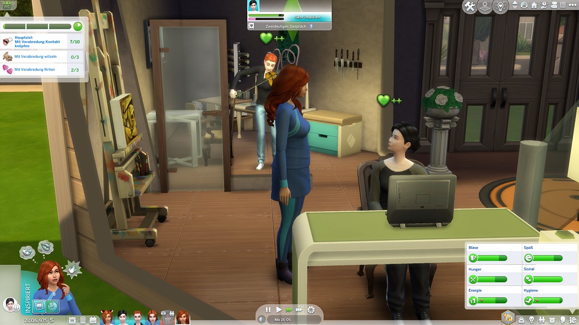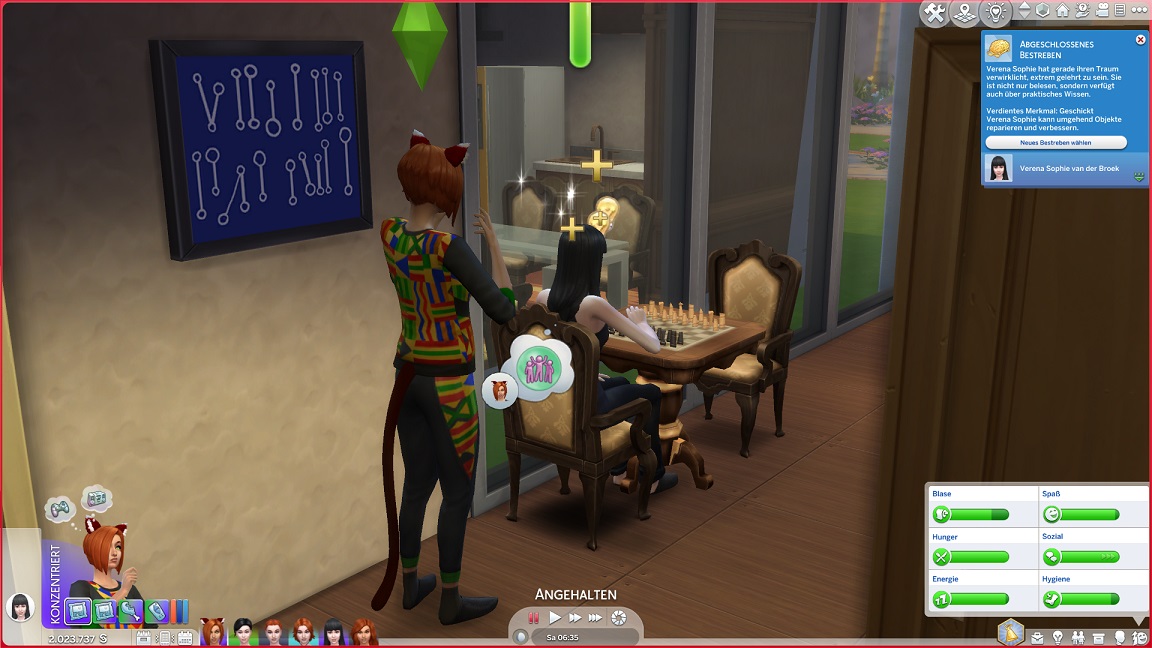 ... testet einmal die Gesamteinnahmen aus und wendet sich nach diesem Ego-Dämpfer der Malerei zu. Die kumulierten Boni aus Unterricht, Vorteilen und Raum-Aura schlagen dermaßen ein, dass sie bereits mit dem ersten Bild sechseinhalb Fertigkeitenstufen erlangt.
