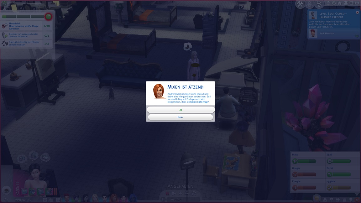 Andromeda stellt fest, dass sie auch Mixen hasst - und das kommt mir ungelegen, da ich sie gerne als Barkeeperin nutzte, aber was will man machen?