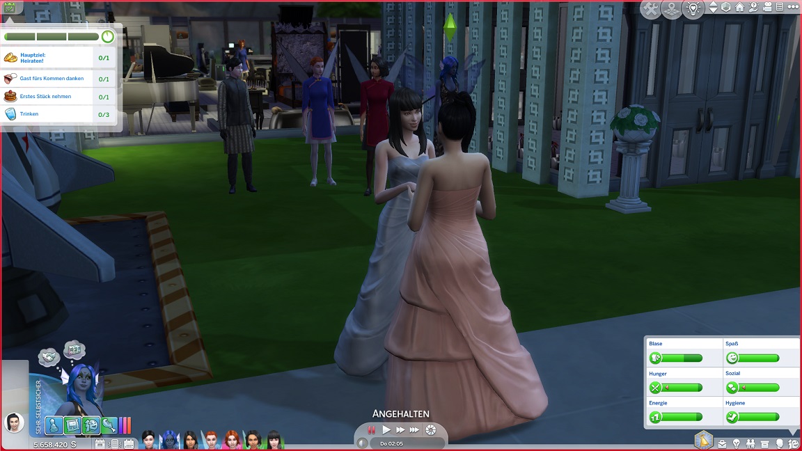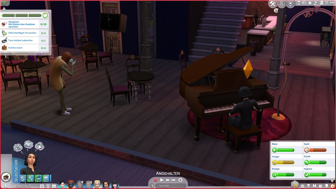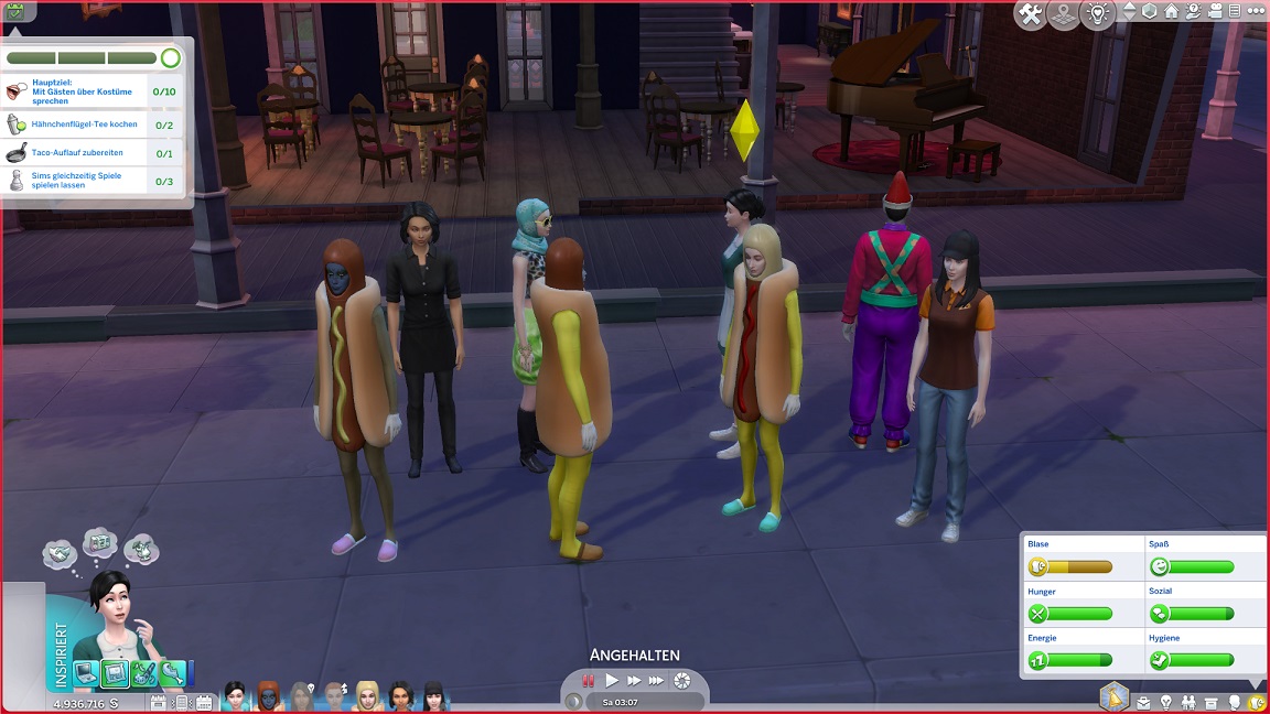 Da ich erst spät feststelle, dass es hier ja um Kostümdialoge statt Gespräche geht, und mir dann die Idee einer verpatzten Veranstaltung gefiel, endet die VIP-Party gänzlich medaillenlos. James greift ebenfalls zur Geige - man soll nicht sagen, dass sie sich nicht amüsierten.