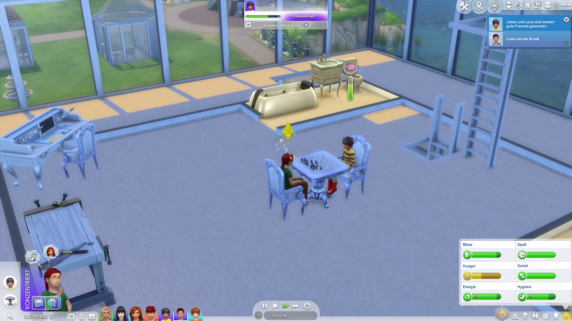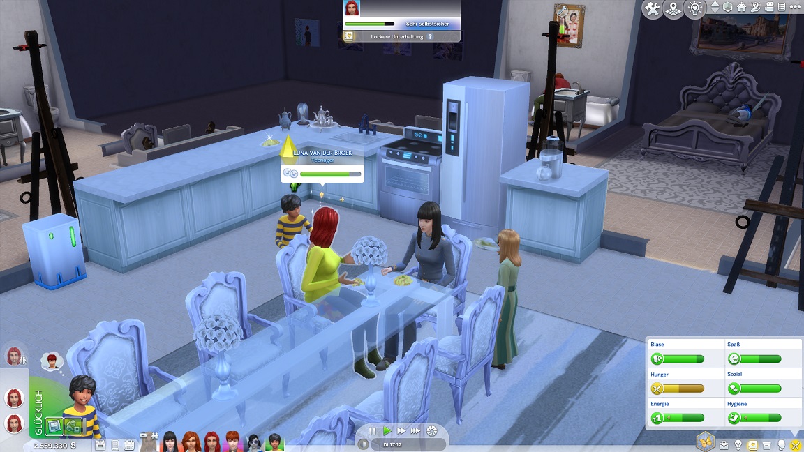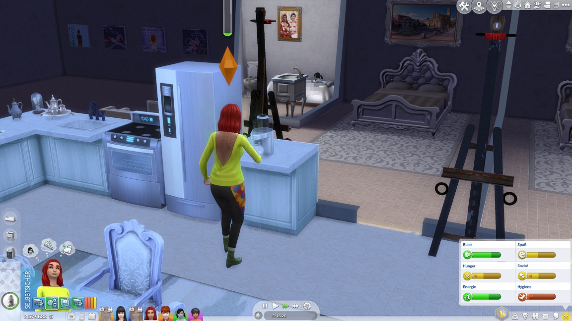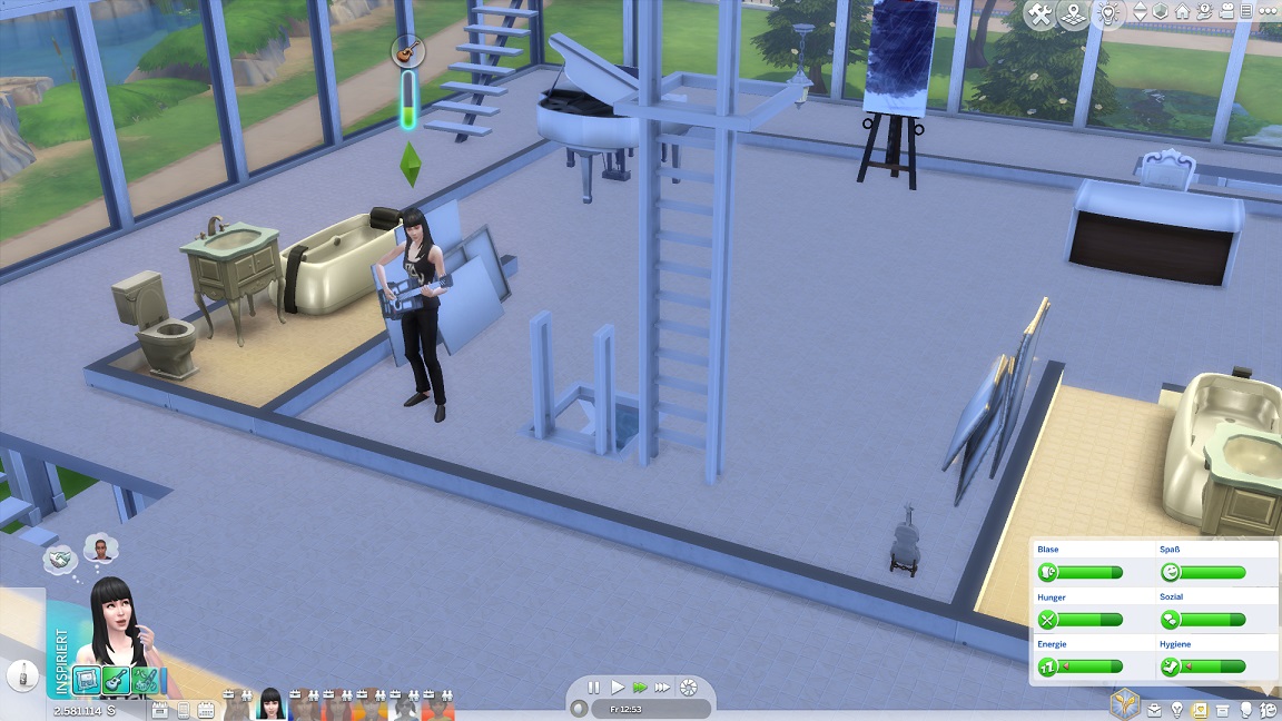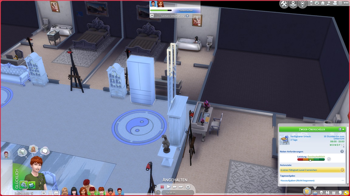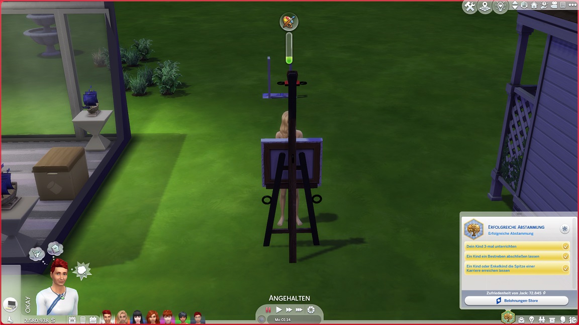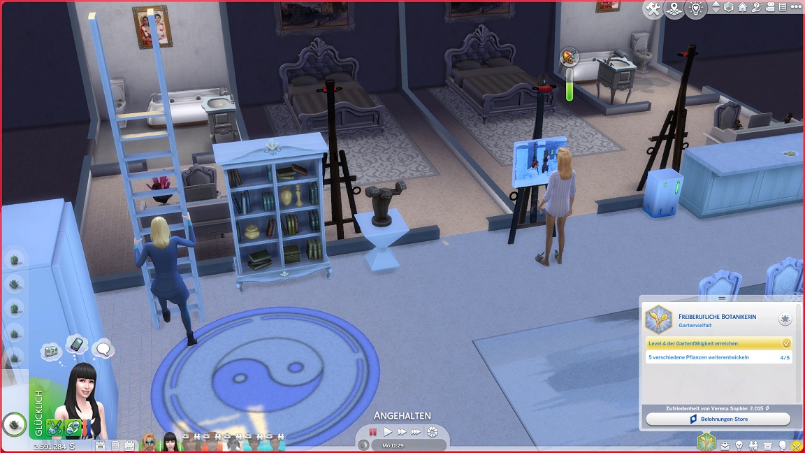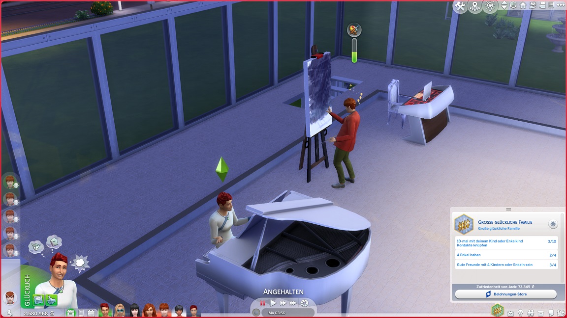 Andrew stellt fest, dass er die Heimwerkerei hasst, weswegen er die Aufgabe an Luna weitergibt. Verena dreht Däumchen und lässt sich von den Gedankenblasen dazu verleiten, wieder einmal zu musizieren. Jacks Gastspiel hatte Folgen, da er als Maler-Mäzen mit abgeschlossener Karriere Dinge freischaltete und nun endlich Leinwandstapel für die passende Stimmung sorgen können.