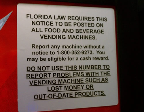 Dieses Schild muss angeblich auf allen Verkaufsautomaten (was ist der korrekte Begriff für "Vending machine"?) in Florida angebracht sein.