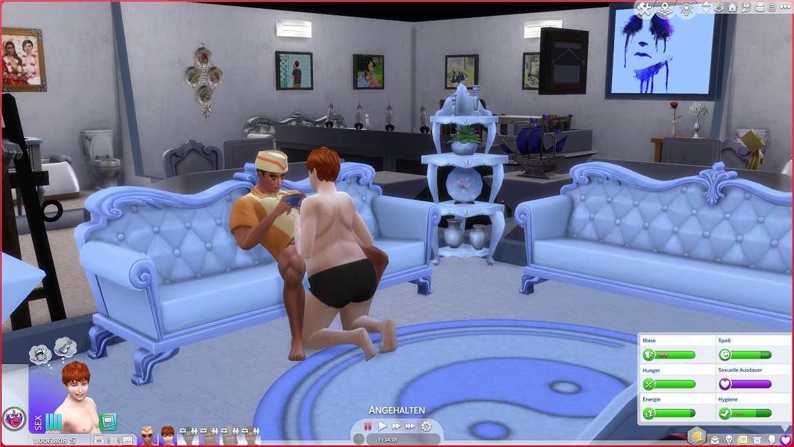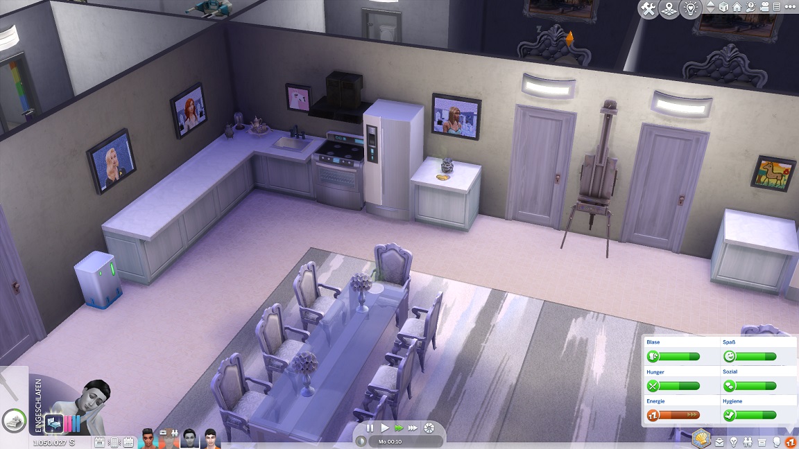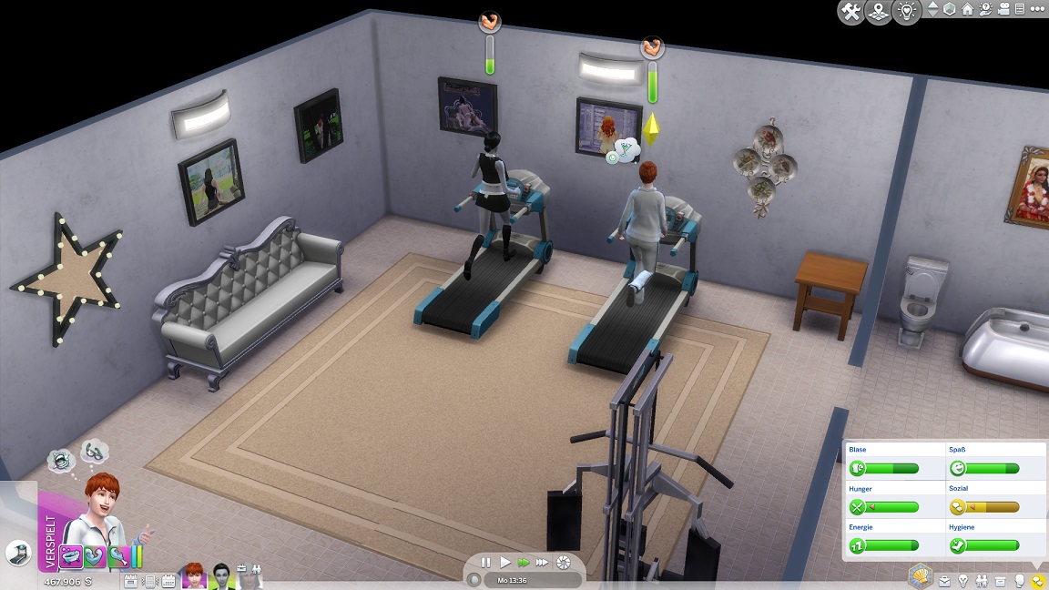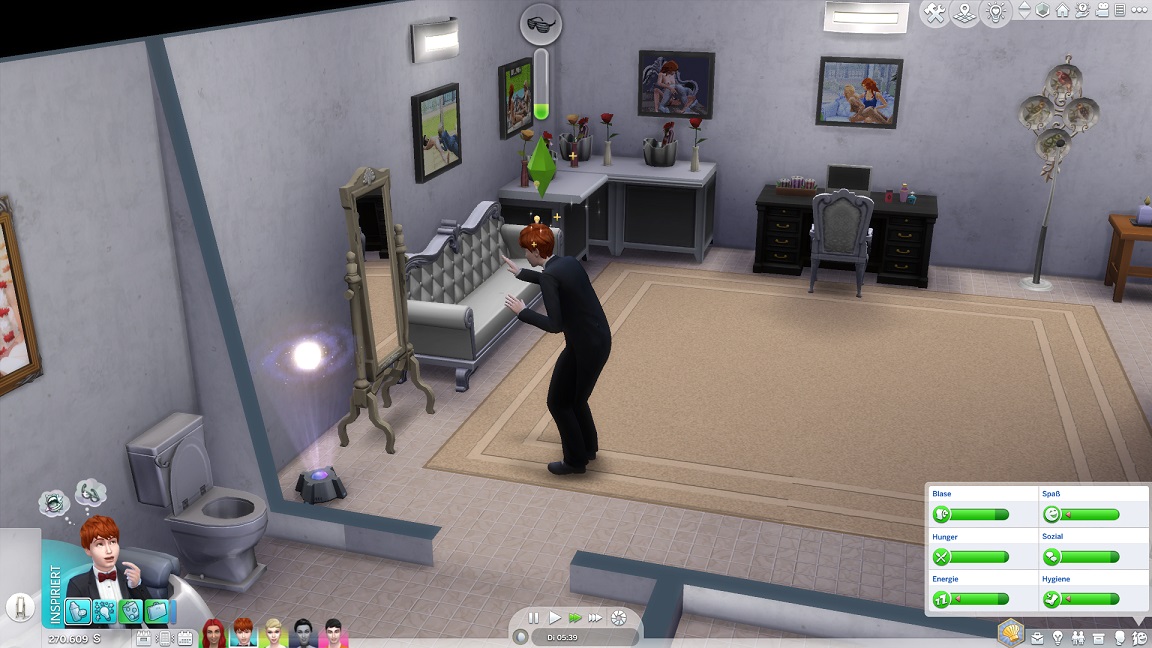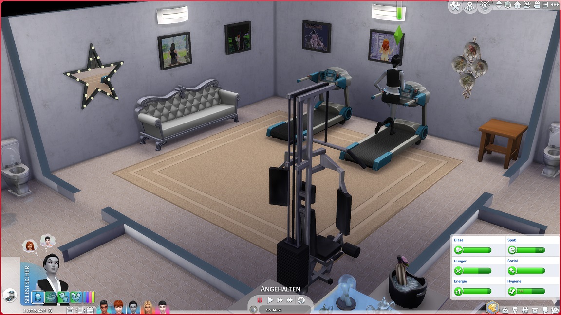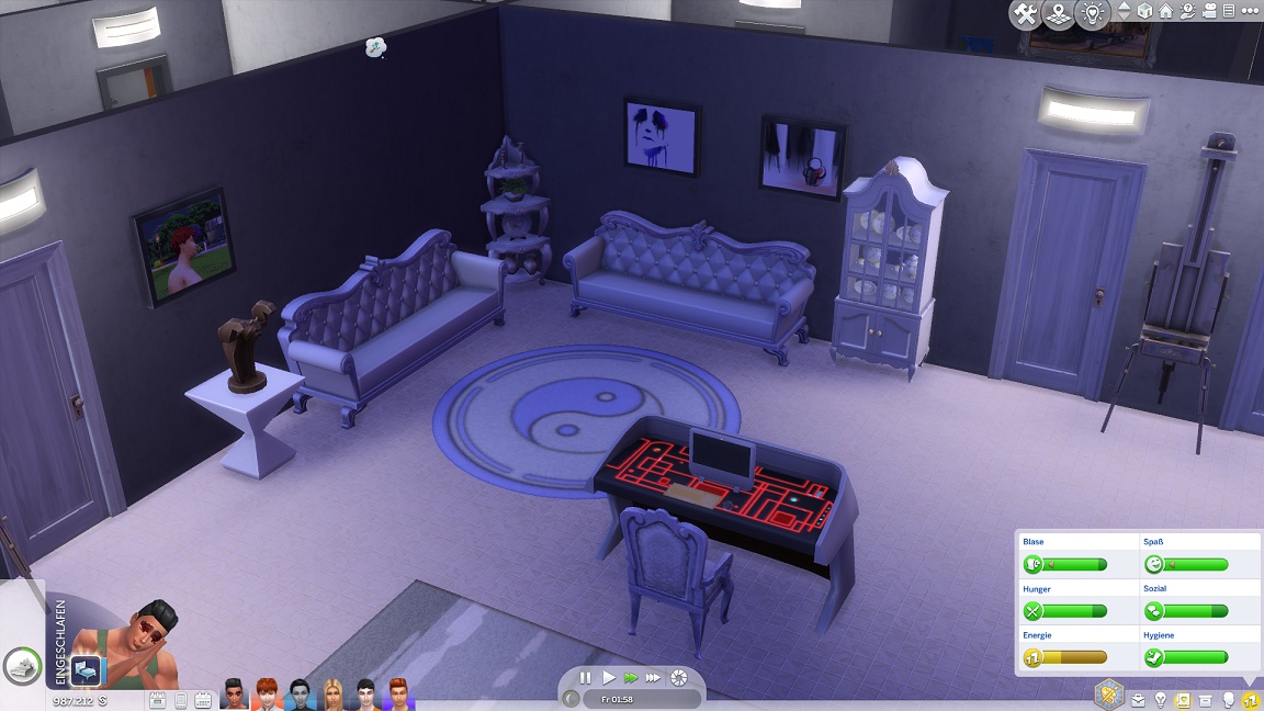 Da Andrew für seine Bestrebung wenigstens ein bisschen Charisma pumpen muss, entsteht nach dem Arbeits-, Kreativ- und dürftigen Sportraum auch einer für den Rest. Die aus anderen Räumen herverschobenen Bilder erlauben, die Stimmung je nach Wunsch auf "selbstbewusst", "verspielt" oder "kokett" zu schalten.