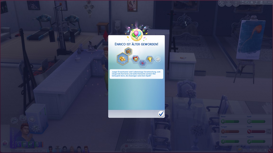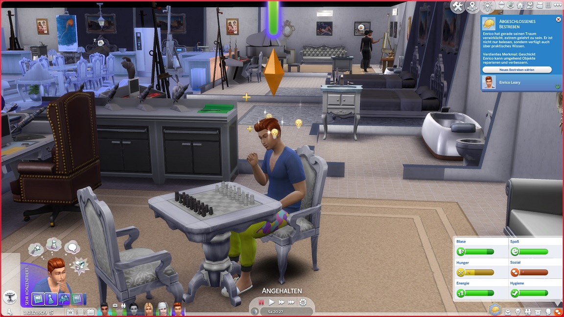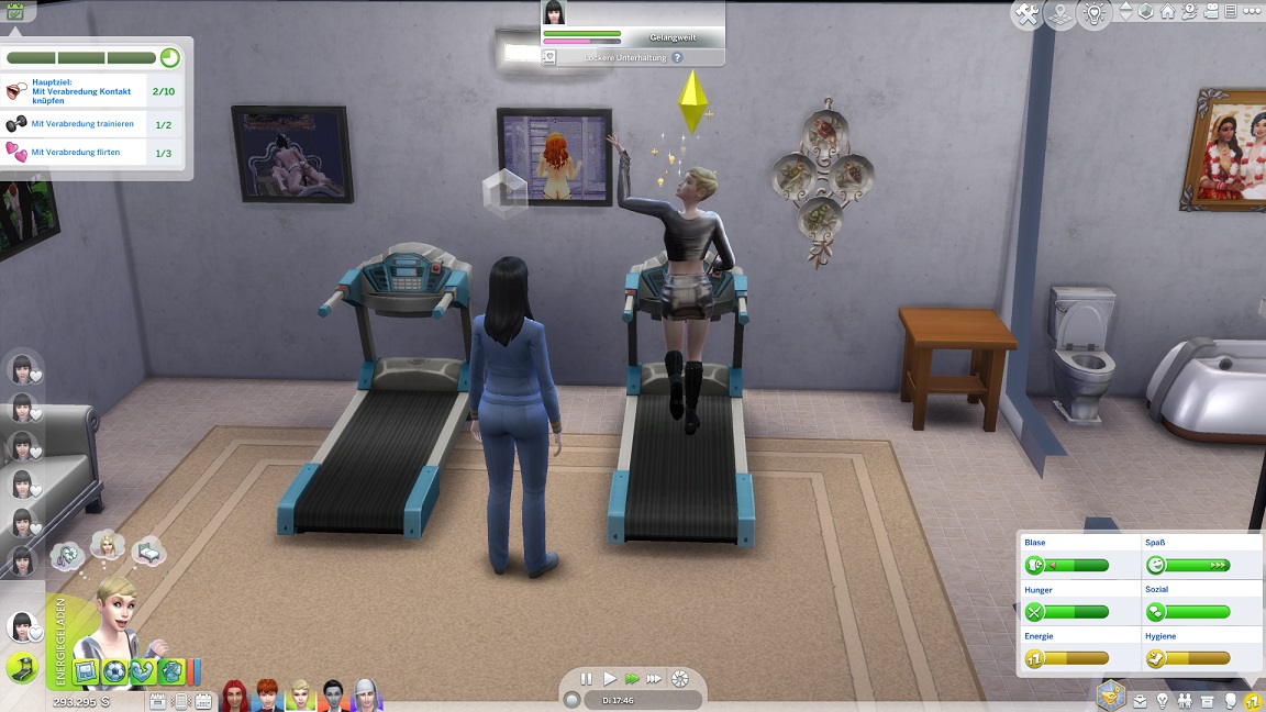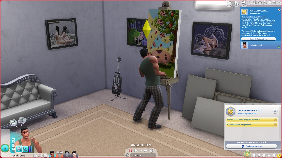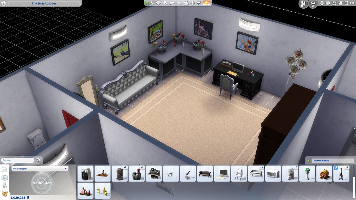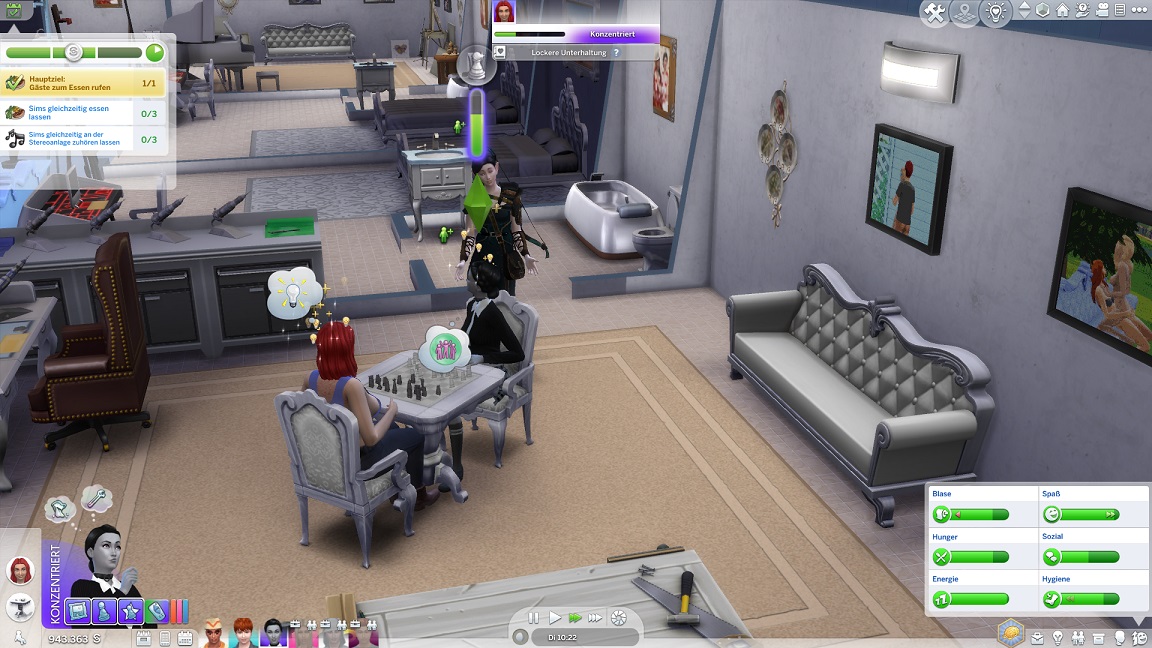 Da Andrew für seine Bestrebung wenigstens ein bisschen Charisma pumpen muss, entsteht nach dem Arbeits-, Kreativ- und dürftigen Sportraum auch einer für den Rest. Die aus anderen Räumen herverschobenen Bilder erlauben, die Stimmung je nach Wunsch auf "selbstbewusst", "verspielt" oder "kokett" zu schalten.
