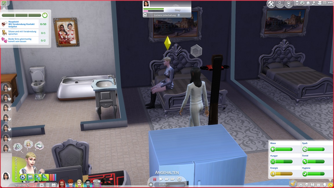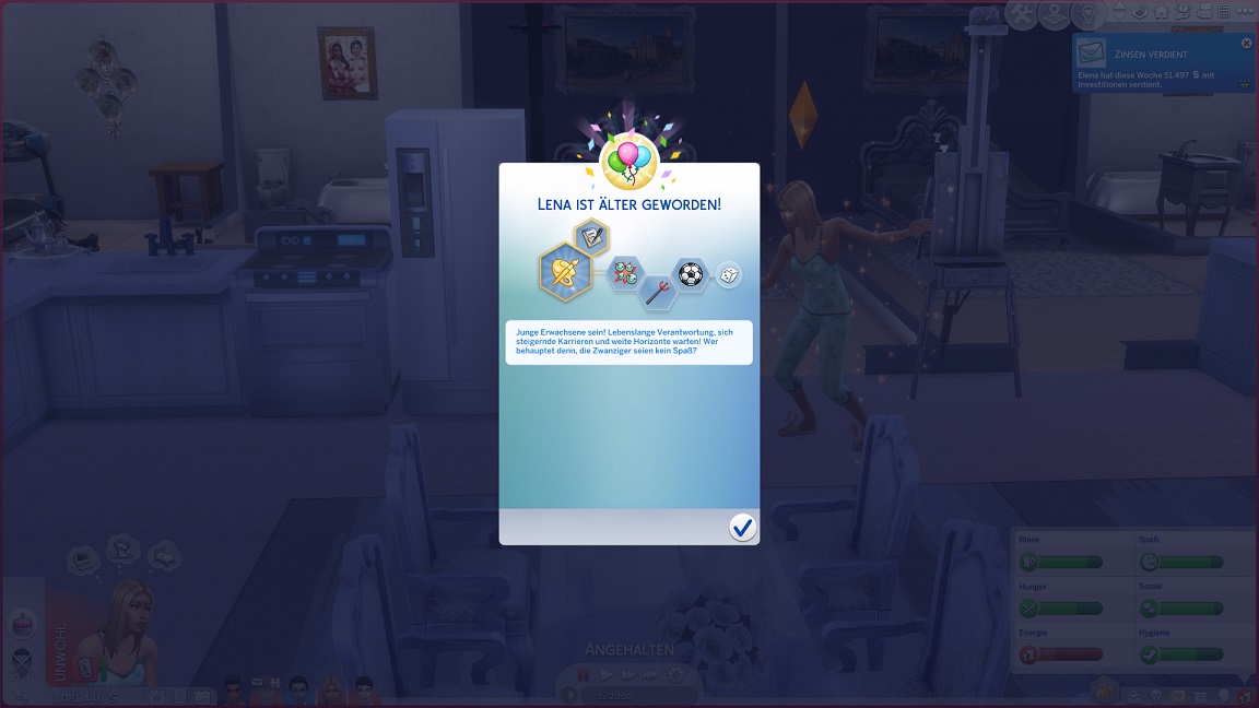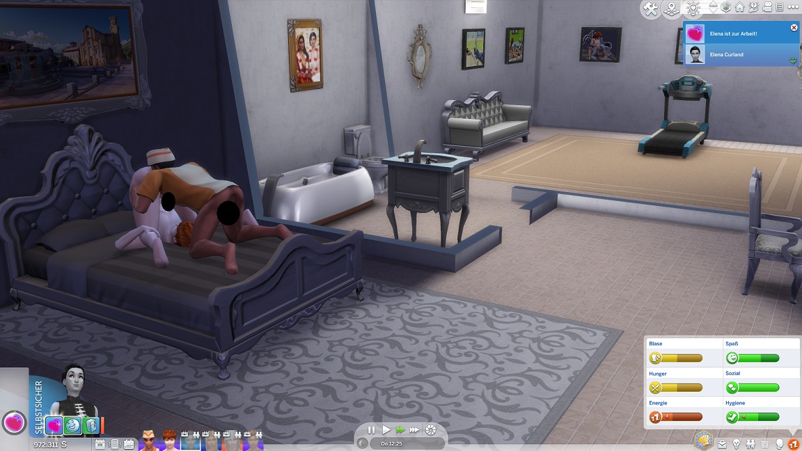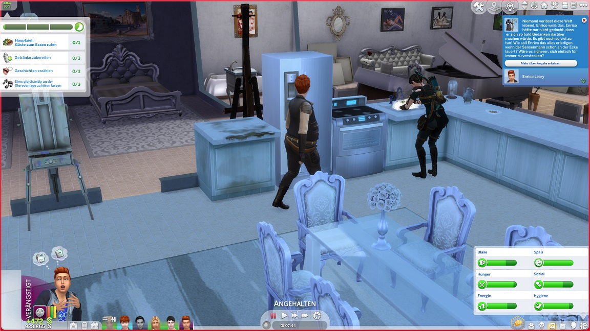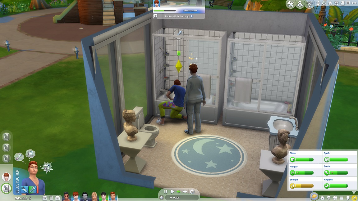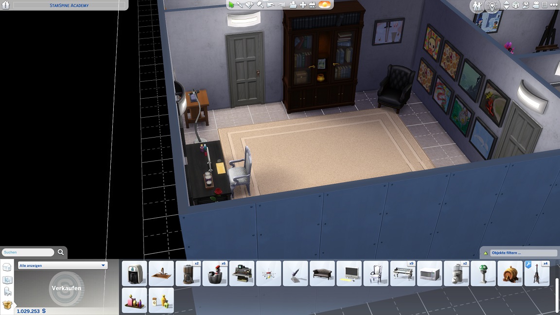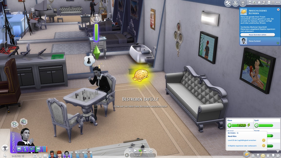 Da Andrew für seine Bestrebung wenigstens ein bisschen Charisma pumpen muss, entsteht nach dem Arbeits-, Kreativ- und dürftigen Sportraum auch einer für den Rest. Die aus anderen Räumen herverschobenen Bilder erlauben, die Stimmung je nach Wunsch auf "selbstbewusst", "verspielt" oder "kokett" zu schalten.
