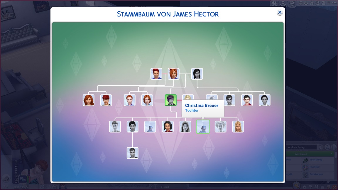 (Zum Titelbild: Es handelt sich um den Stammbaum aller Expeditionsteilnehmer. Gestrichelte Linien bedeuten Adoptionen, bei Verstorbenen kamen Ingame-Fotos zum Einsatz. Soooo viele Linien - und ich beschränkte mich auf den relevanten Teil.)