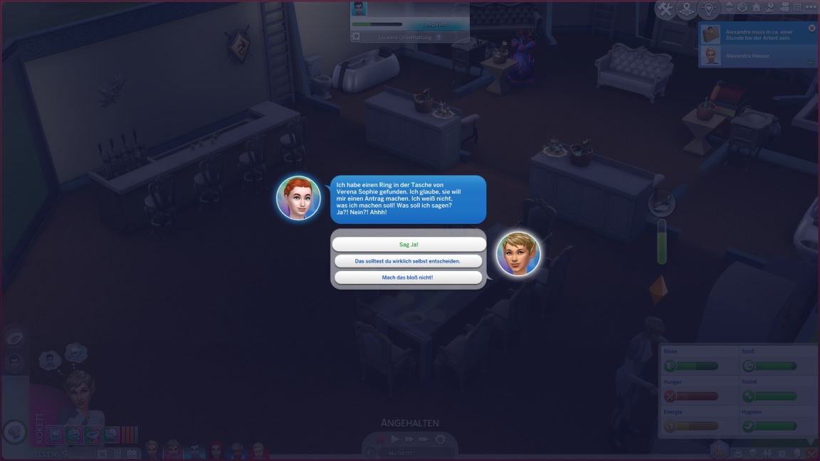 Stevie bittet darum, vorbeischauen zu dürfen, möchte bei Blaidan und Alicia mit einsteigen, erscheint zu spät und geht dann doch mit Annika Schach spielen. Es läuft, wie es nun einmal läuft, mit fast nur den üblichen Paaren.