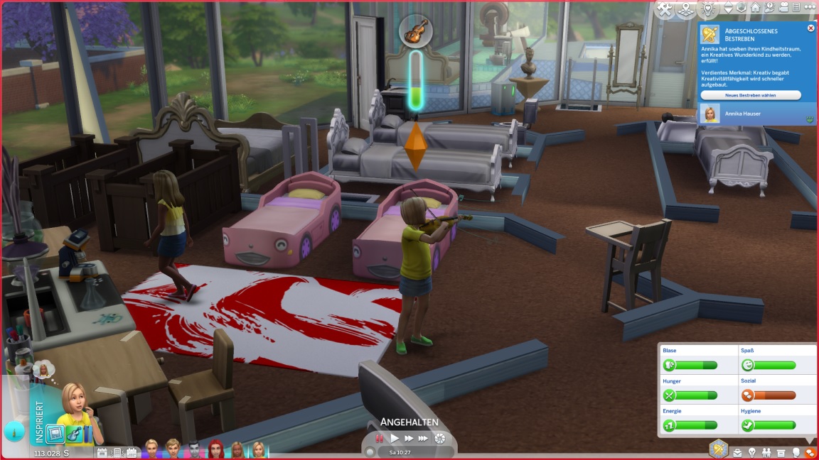 Annika stellt fest, dass sie Geige mag, und wendet sich dem Spielzeug zu.