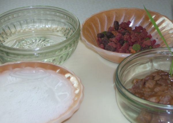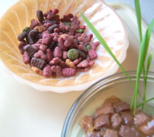 Das heutige Menü: Wasser, Wasser mit Milch, Trockenbrocken und ganz was Feines von Kaninchen & Ente :)