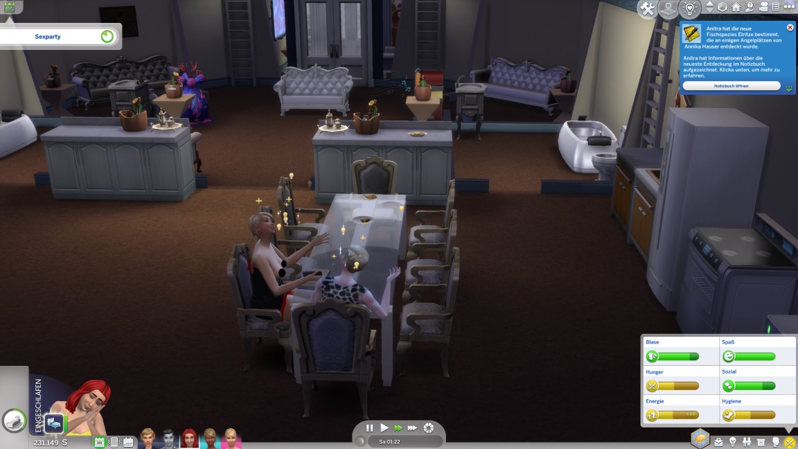 Anitra ruft eine Sexparty aus, die völlig ins Wasser fällt (und letztlich nur dazu führt, dass sie vor Ort weilt, um Alicia Unterricht zu geben.)