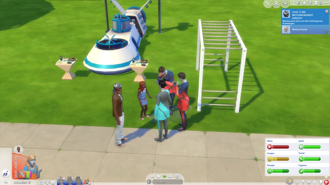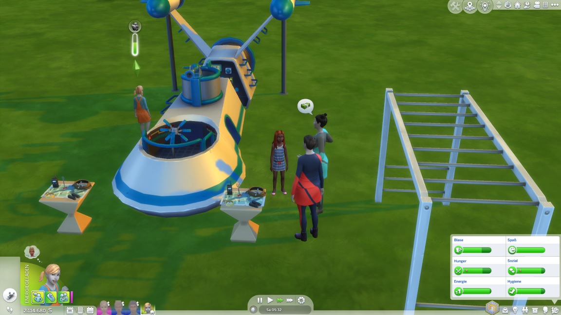 Sie lässt sich Zeit (schon weil sie den Energiegeladen-Zustand aufgrund eines Ratschlags abwarten muss) und nimmt gleich noch das Klettergerüst mit, ehe sie mit drängender Blase in die Heimat aufbricht. Für die beiden Jungs hatte die Kulissen-Natur derweil bereits konkretere Folgen.