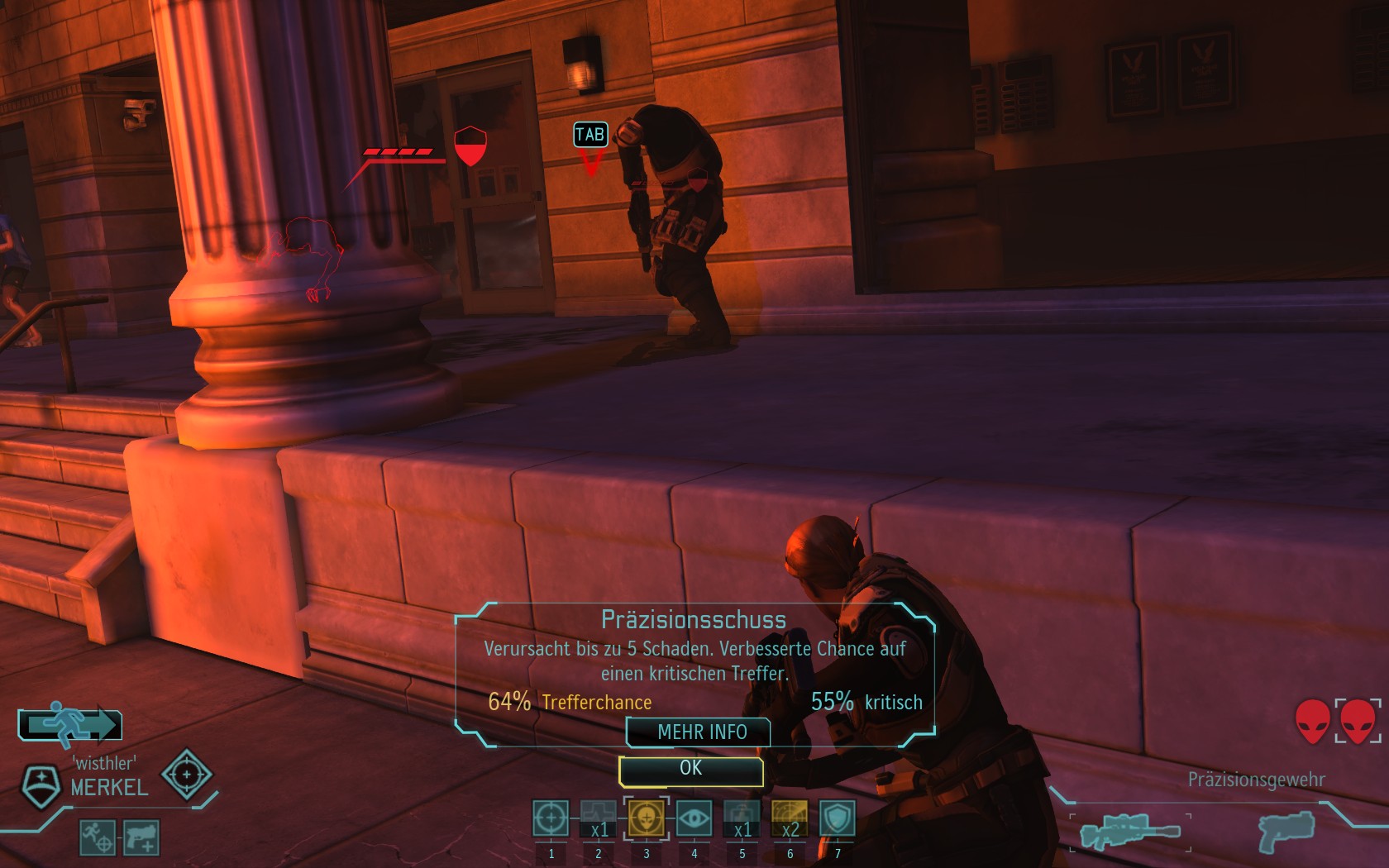 wechselt auf den Präzisionsschuss mit mehr kritischer Trefferwahrscheinlichkeit: