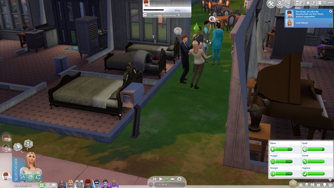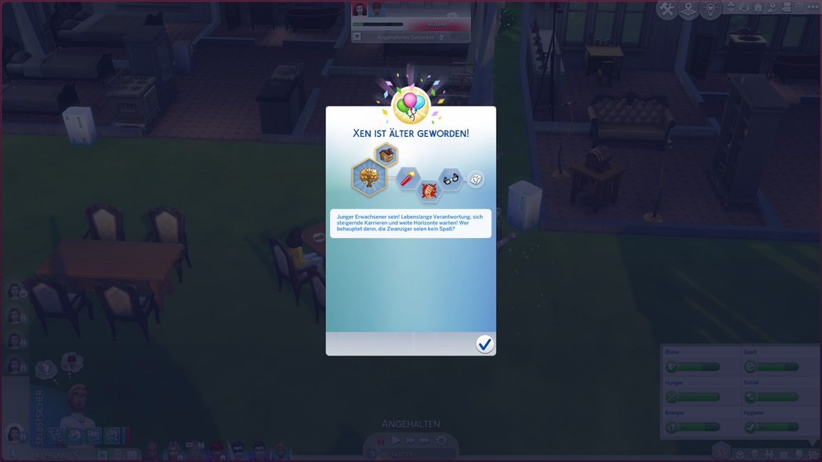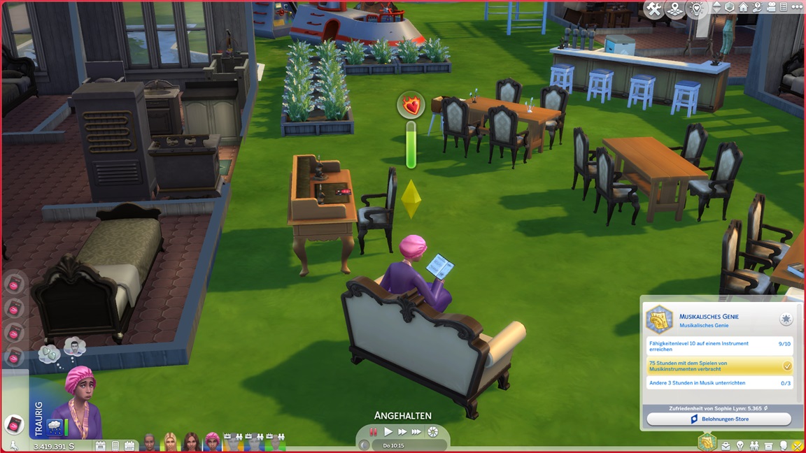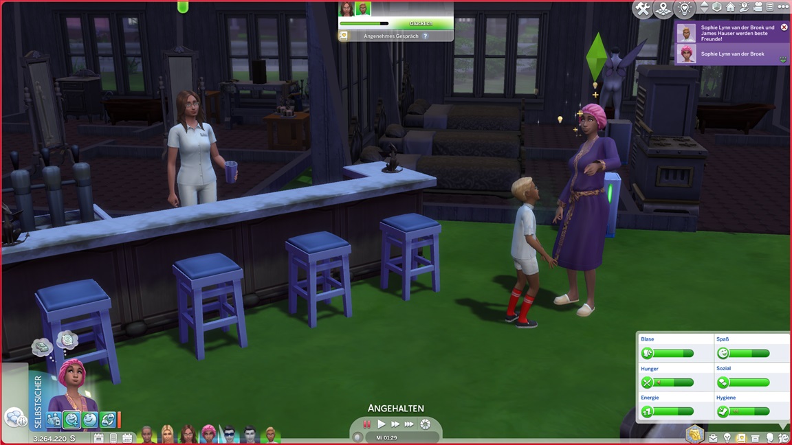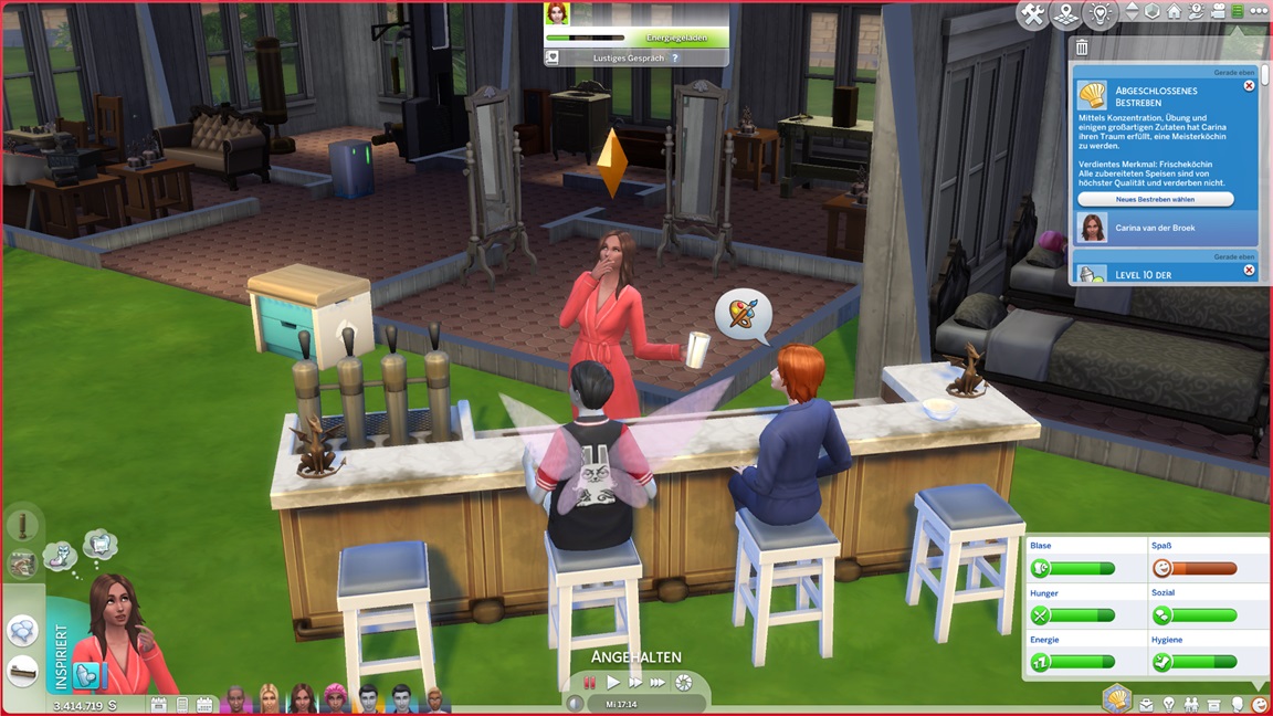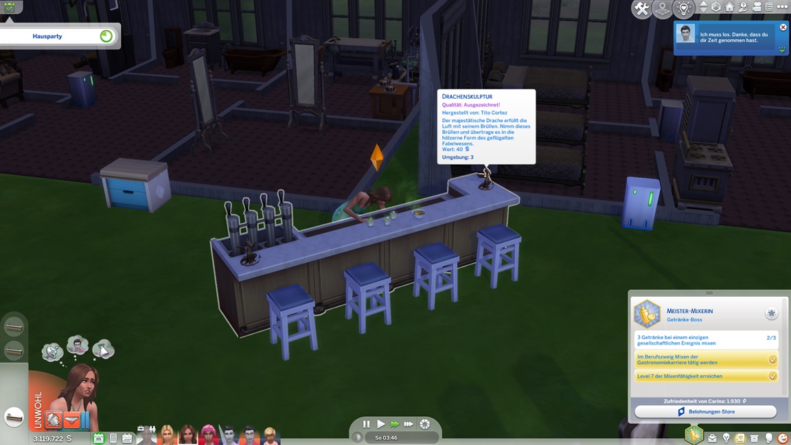Carina ruft "offiziell" eine Hausparty aus - ohne Belohnungen und allein mit Gästen aus der Kolonie -, damit sie einmal schnell die benötigten drei Getränke abarbeiten kann.