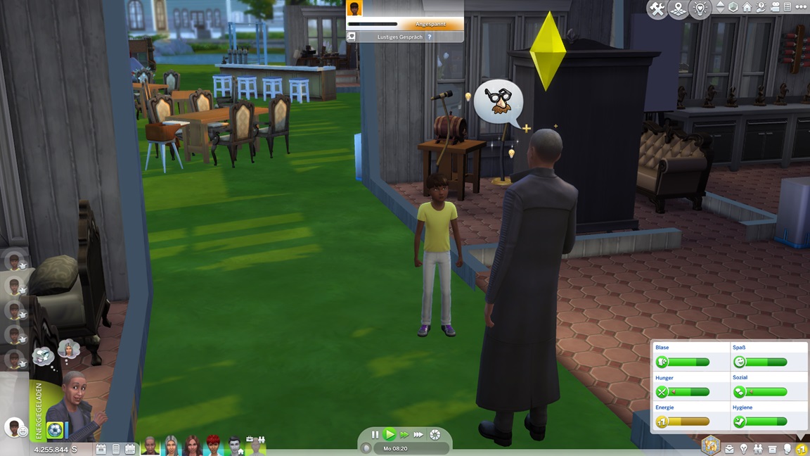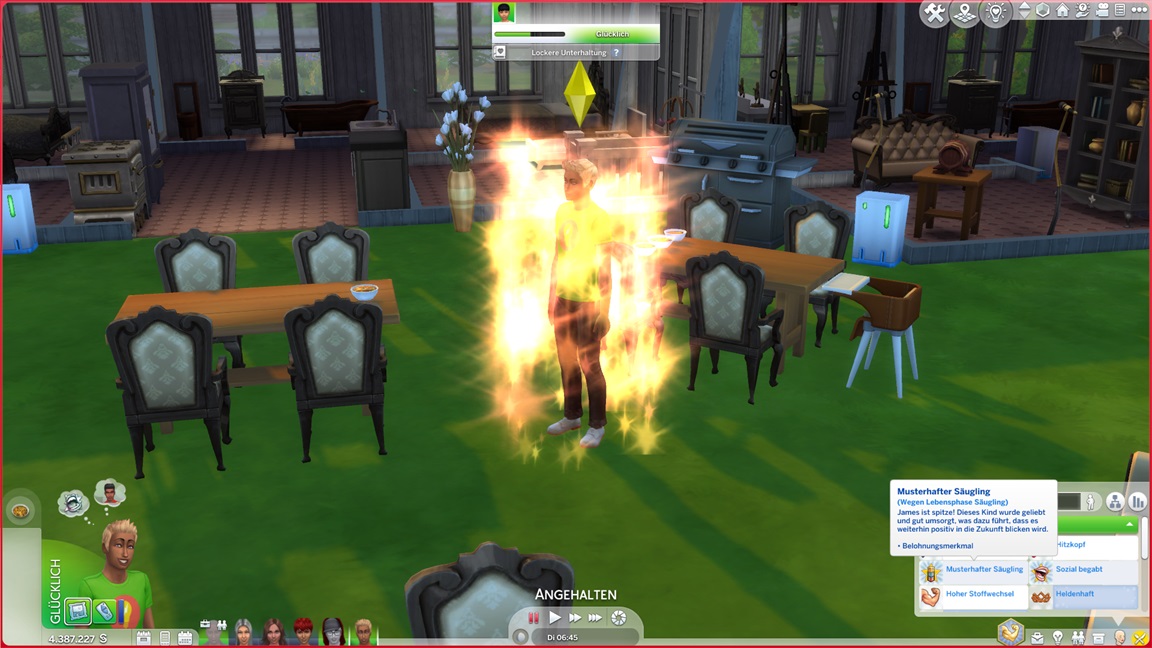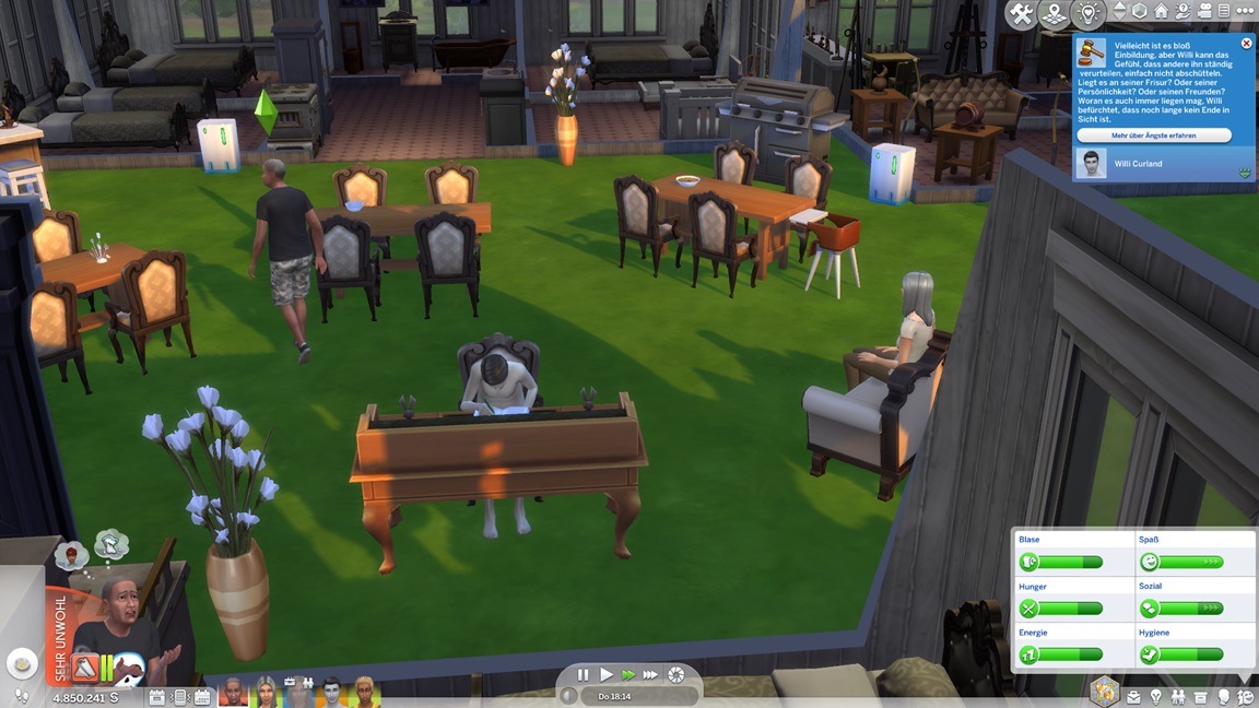 James stellt fest, dass er Gitarre mag. Da Willis Einsteiger-Fortschritt-Punkt "Zur Arbeit gehen" wieder einmal klemmt, befreit ihn die Konsole. Er leidet unter den derben Sitten, die die Kolonisten immer dann an den Tag legen, wenn ich ihnen nicht auf die Finger klopfe, kann aber die resultierende Angst recht schnell abarbeiten.