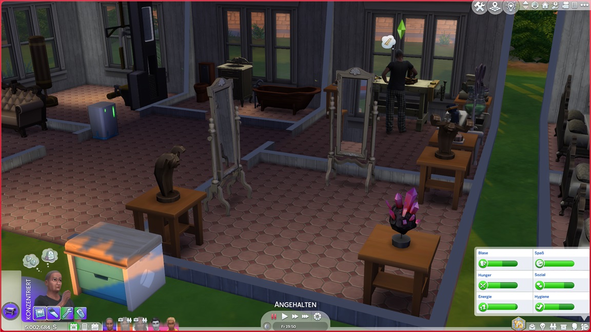 Weil er eine Belohnung missverstand (und die Lichtshow annahm), zimmert Keiran Beistelltische für den Charismaraum, die dann provisorisch gefüllt werden - mit ebenfalls frisch geschnitzten Figuren (neben einem noch aus dem Leben vor der Kolonie stammenden Meteoriten), da Keiran dieser Beschäftigungstherapie bedarf.