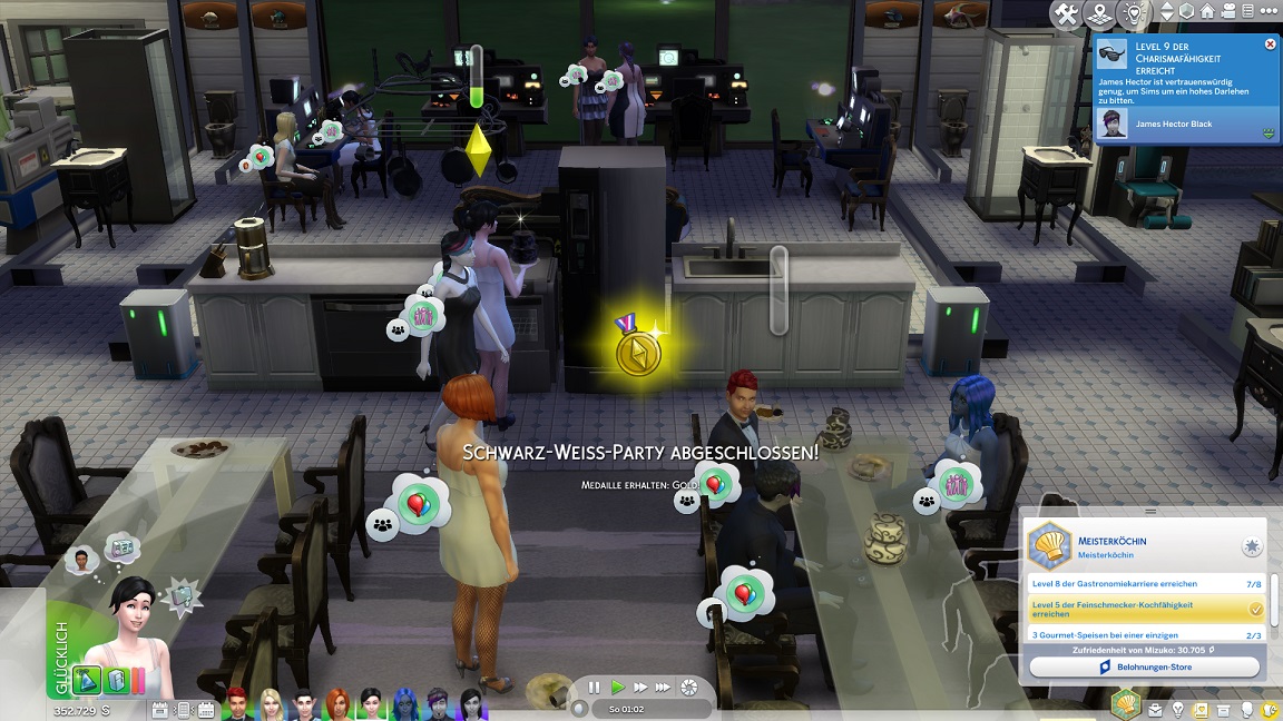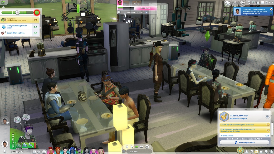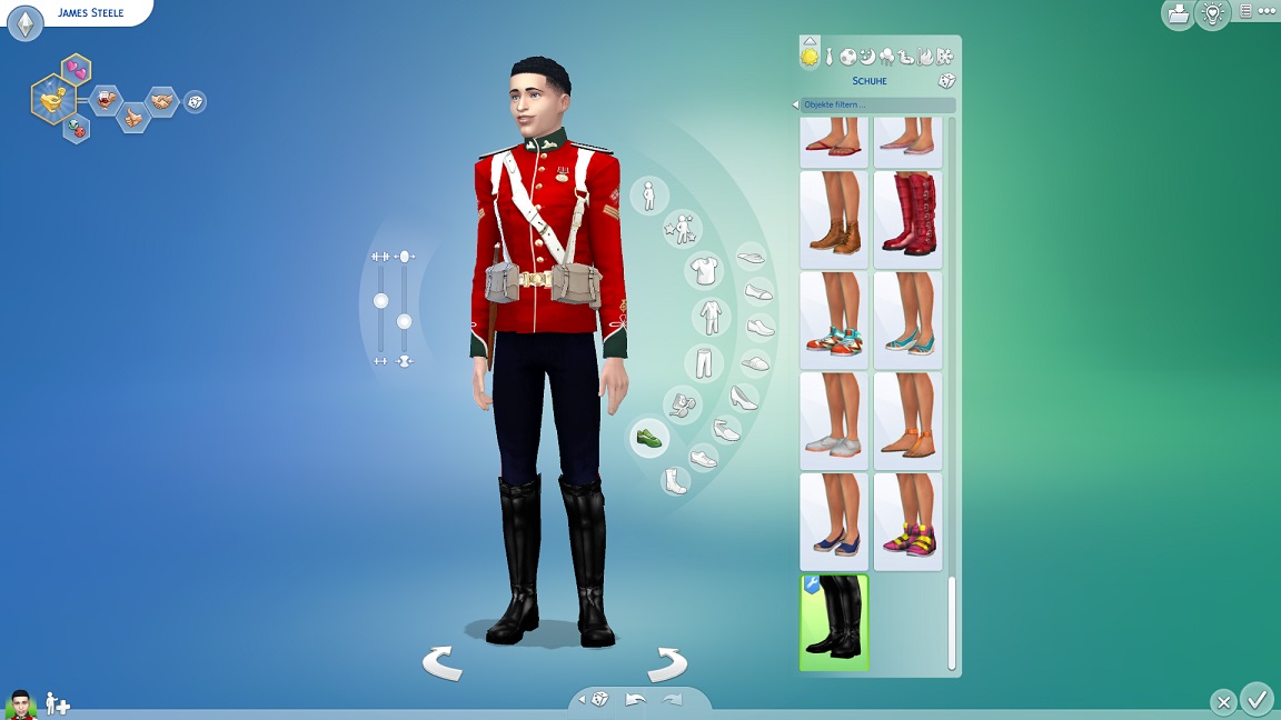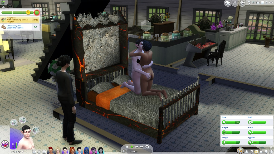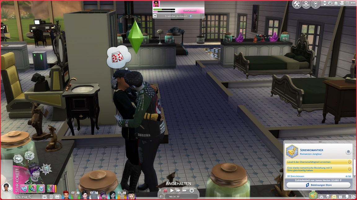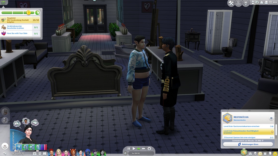 Auf der anderen Seite... und hier möchte ich doch noch eine Anekdote erzählen: Als ich nach küssbaren Zielen für James suchte und dafür die einladbaren Kandidaten durchsah, wirkte es aufgrund eines Kostüms ohne Hut, als sei seine Spielpartnerin Sophia nun volljährig geworden. Da schreckte ich zurück und ließ ihn lieber die Reinigungskraft umgarnen...