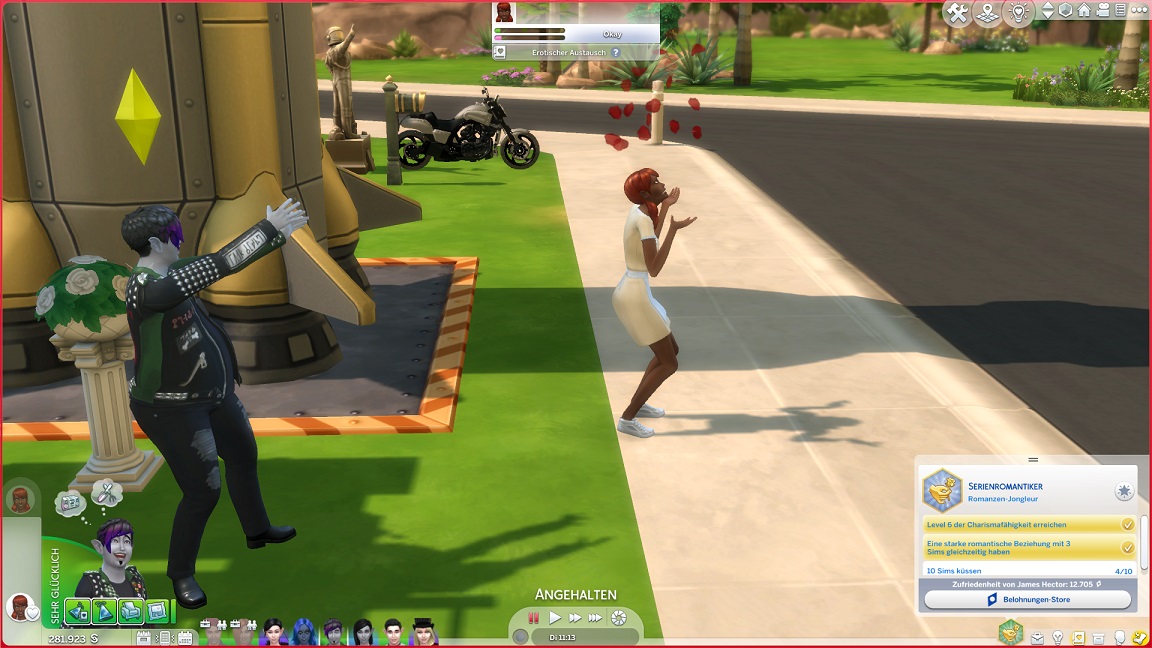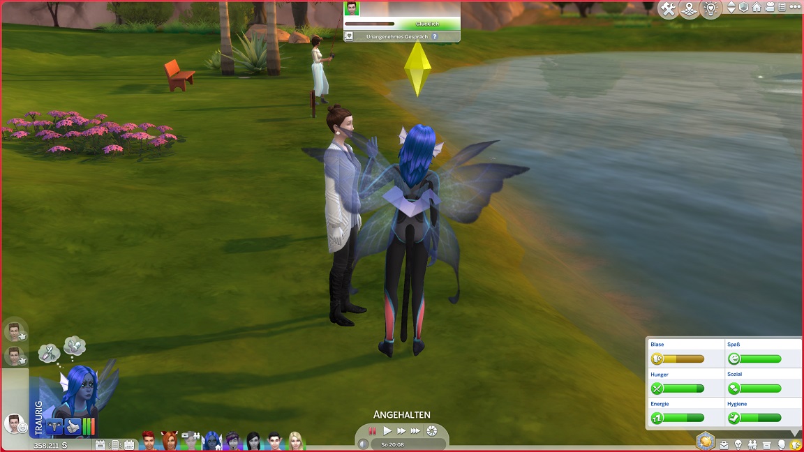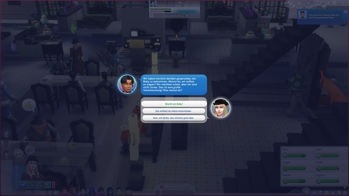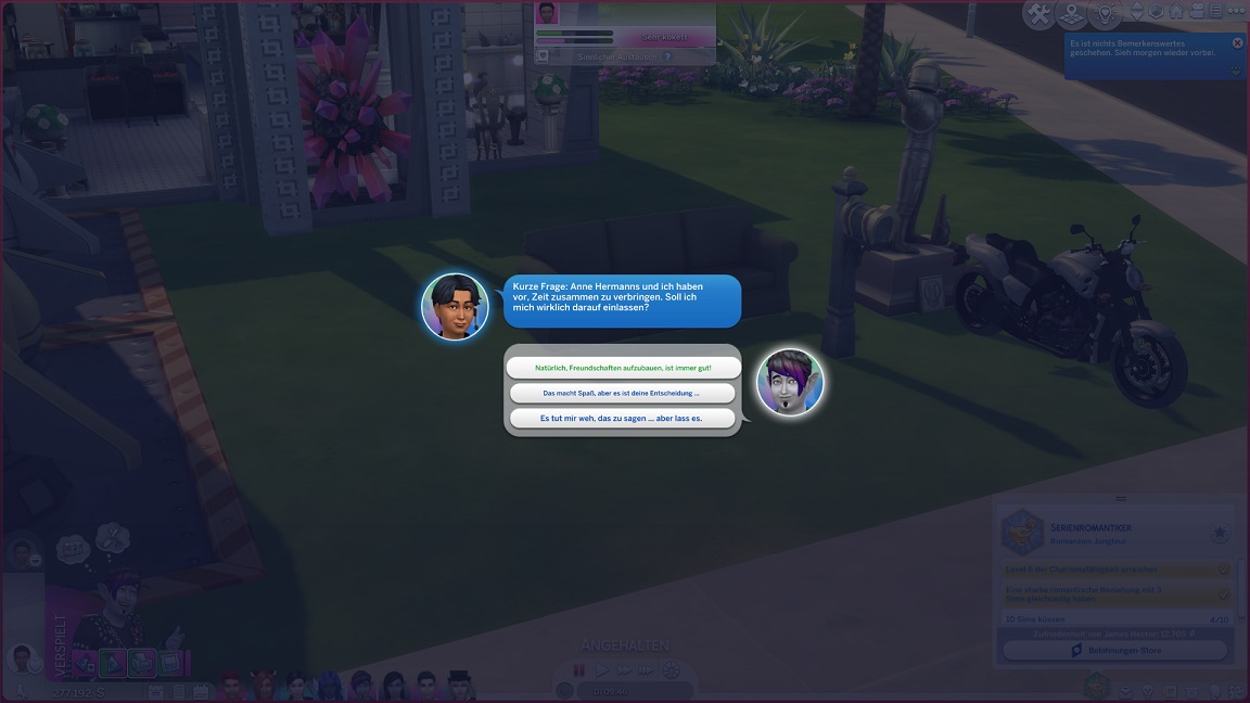 ... wie aber geschrieben: Die Sims kommen mit diesen Subtilitäten nicht gut klar, und letztlich wäre es nur auf ein "Kommen sie zusammen und formen sie eine Nuklearfamilie oder entwickeln sie ihre Leben vorwiegend aneinander vorbei?" herausgelaufen; in meinen bisherigen Spielen sorgte ja auch der Mod dafür, dass direkt das Anziehungs-Popup aufblitzt und sie recht schnell zusammenfanden.