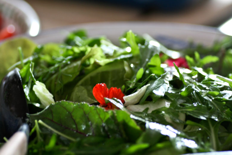 Kräutersalat mit essbaren Blüten und Parmesanspäne