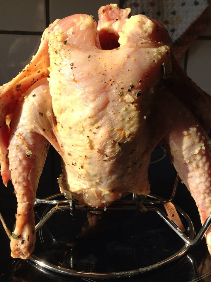 Im Anschluß die Haut vom Körper mit den Fingern lösen. In die Freiräume habe ich eine Butter mit Orangen und Estragon geschmiert. Dann kam das Huhn auf den Bock, dressiert und drapiert