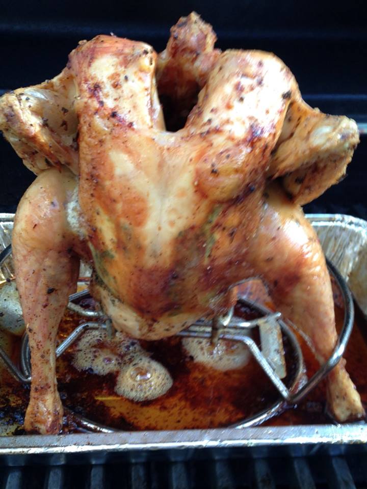 Dann ab auf den Grill, immer mal wieder den Deckel hoch, um die zerlassene Butter wieder über die Haut zu pinseln.