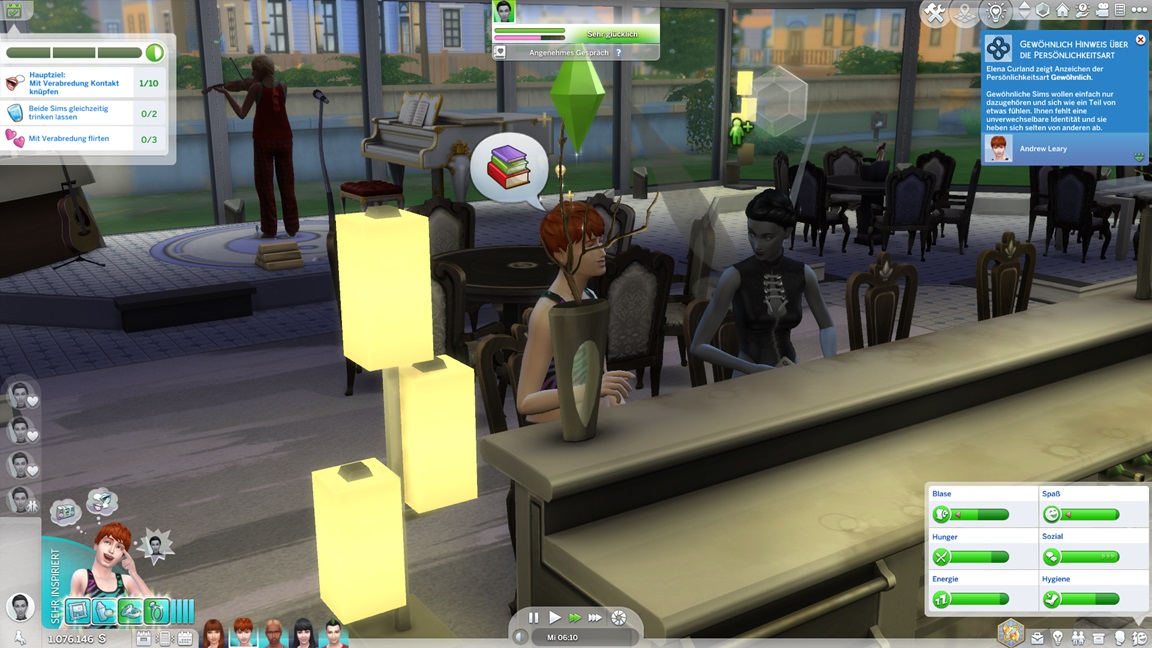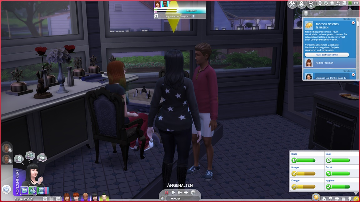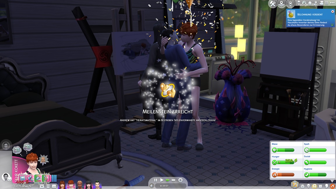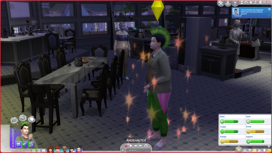 Carolin verpuppt sich, gewinnt das Bonusmerkmal und erhält "engelsgleich". Als mir ähnlich der Belegschaft die Nerven schwinden, lasse ich Marcian direkt mit vor den Kuchen treten. Er präsentiert sich "heikel" - und ebenfalls mit Bonusmerkmal.