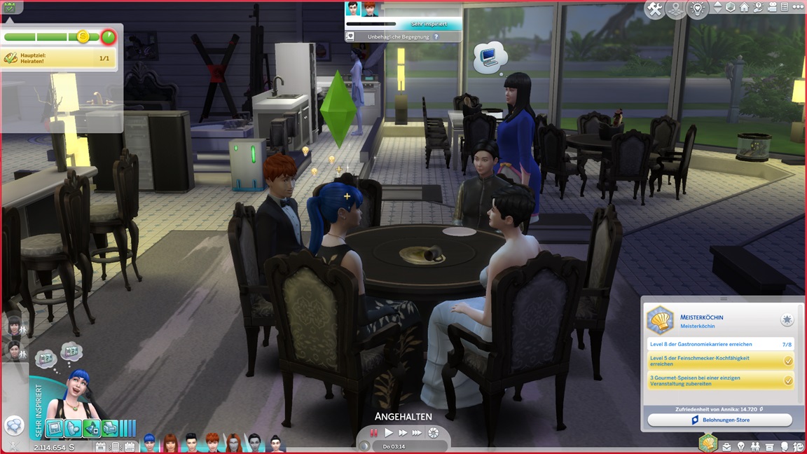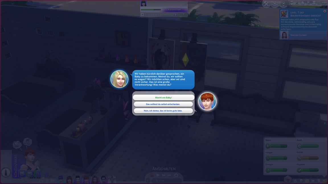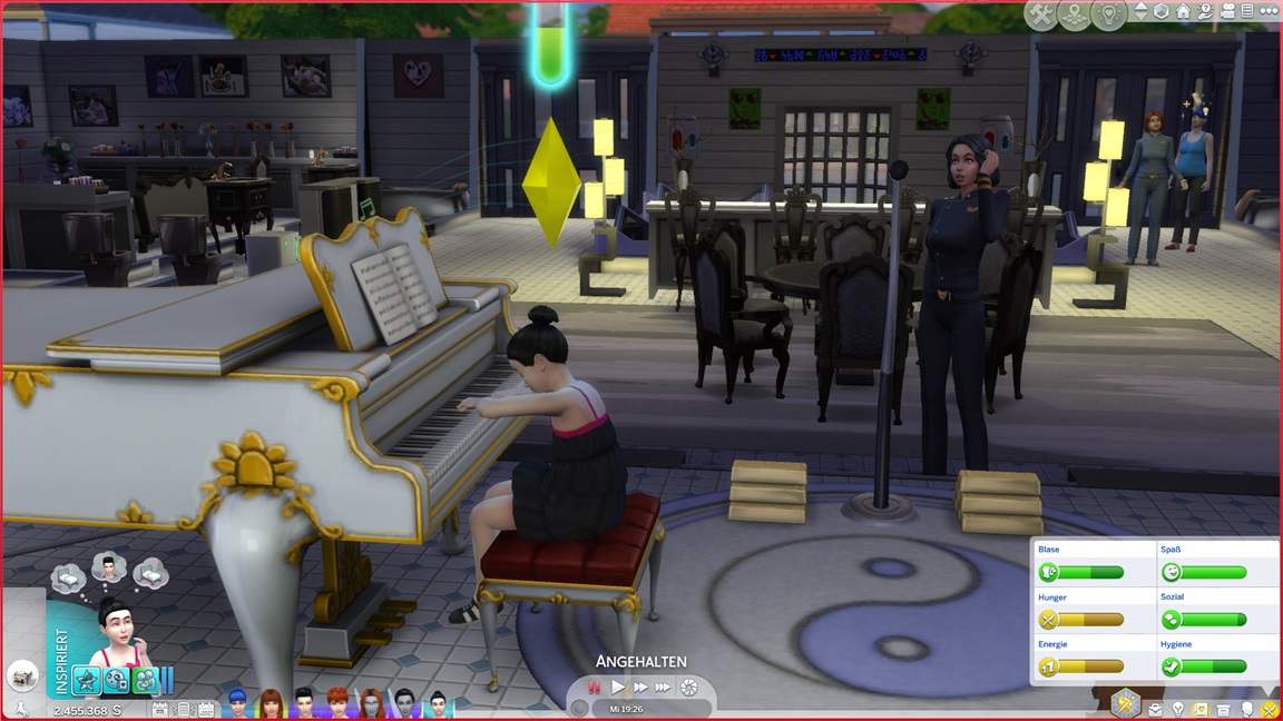 Marcian, der für sein Bestreben Bilder zum Verkauf herauspumpt, stellt fest, dass er Malen mag. Als Carolin zu Besuch weilt, lässt sie sich auf die Stemmbank bitten - oooh, so viele NSCs zeigen die Spuren der Partys im Vier Vorne.