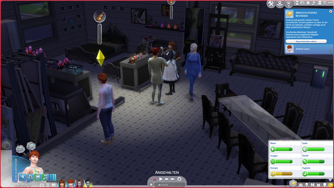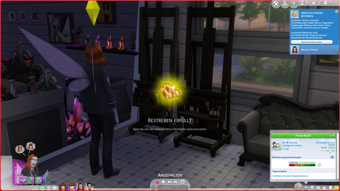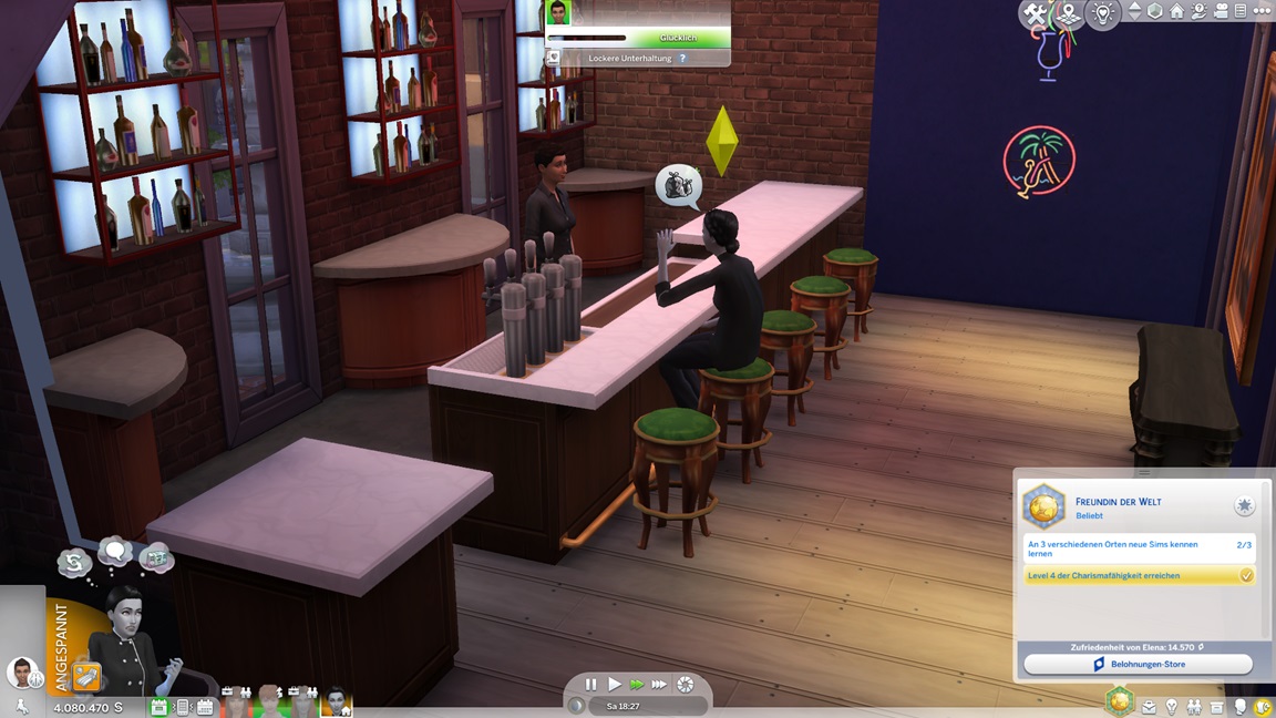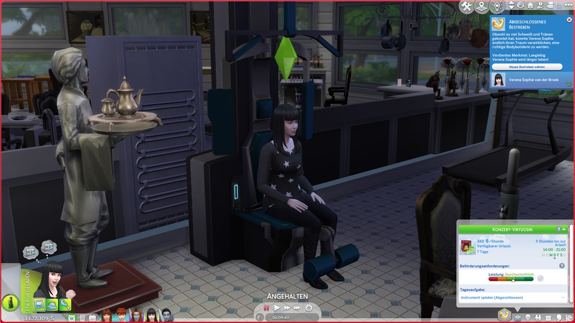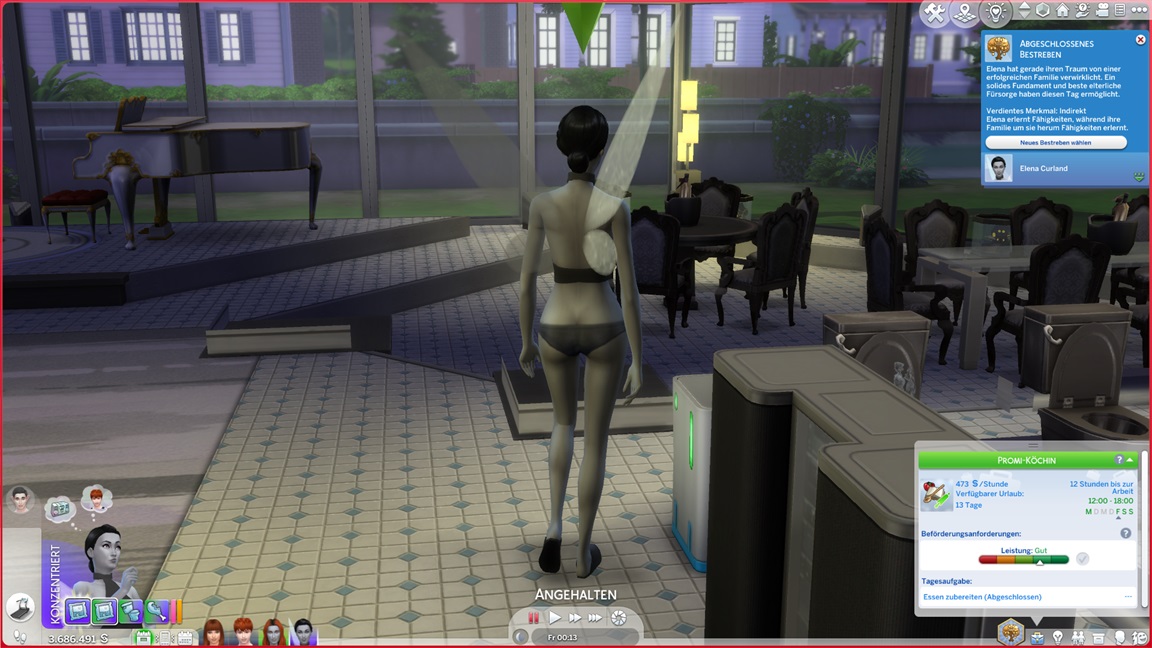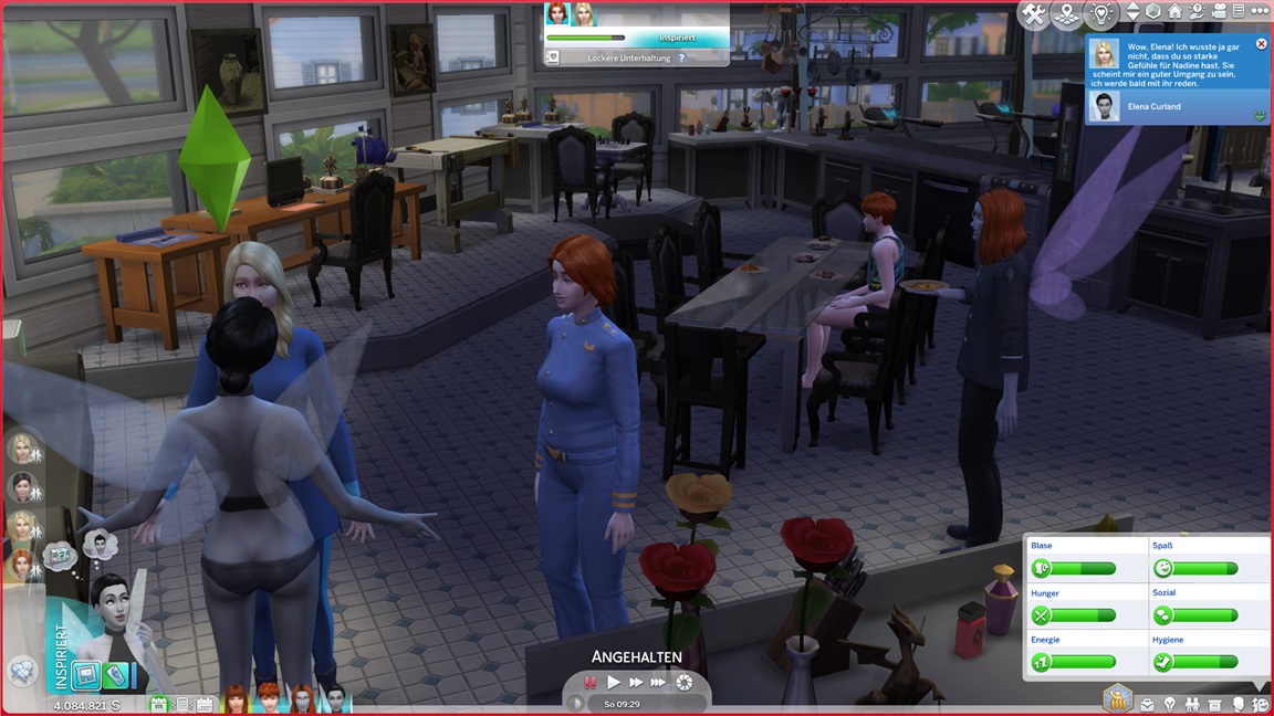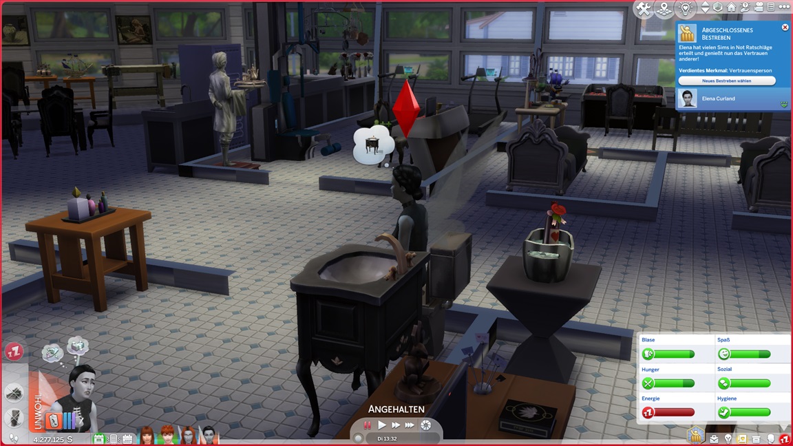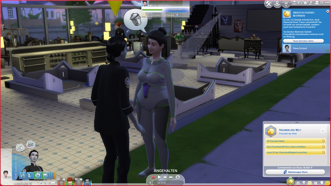 Das bekannte Phänomen bei höherstufigen Sims: Bestrebungen können aufgrund der Vorarbeit recht fix erledigt werden, und Elena besaß bereits eine maximierte Charismafertigkeit sowie ausreichend Freunde. Sie lässt Beratung folgen.