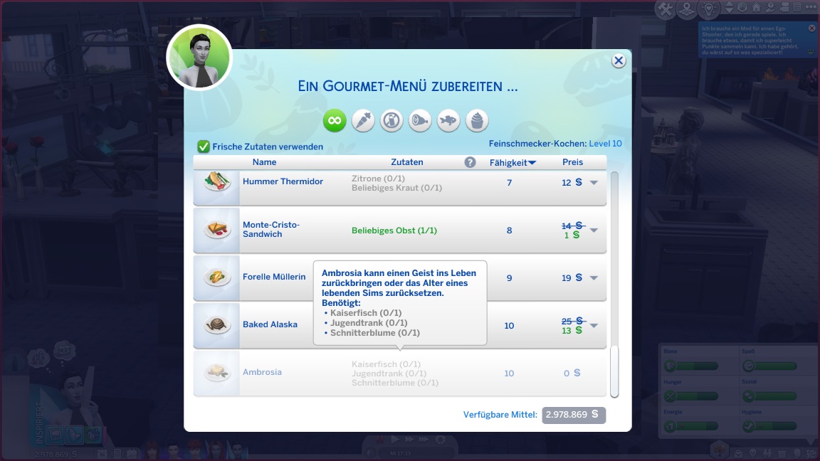 Aktuell besitzen sie jemanden mit der benötigten Stufe 10 in Gourmetküche, aber das ist auch alles. Ein Kaiserfisch muss noch erfischt werden. Nadine kehrt zur Arbeit zurück.
