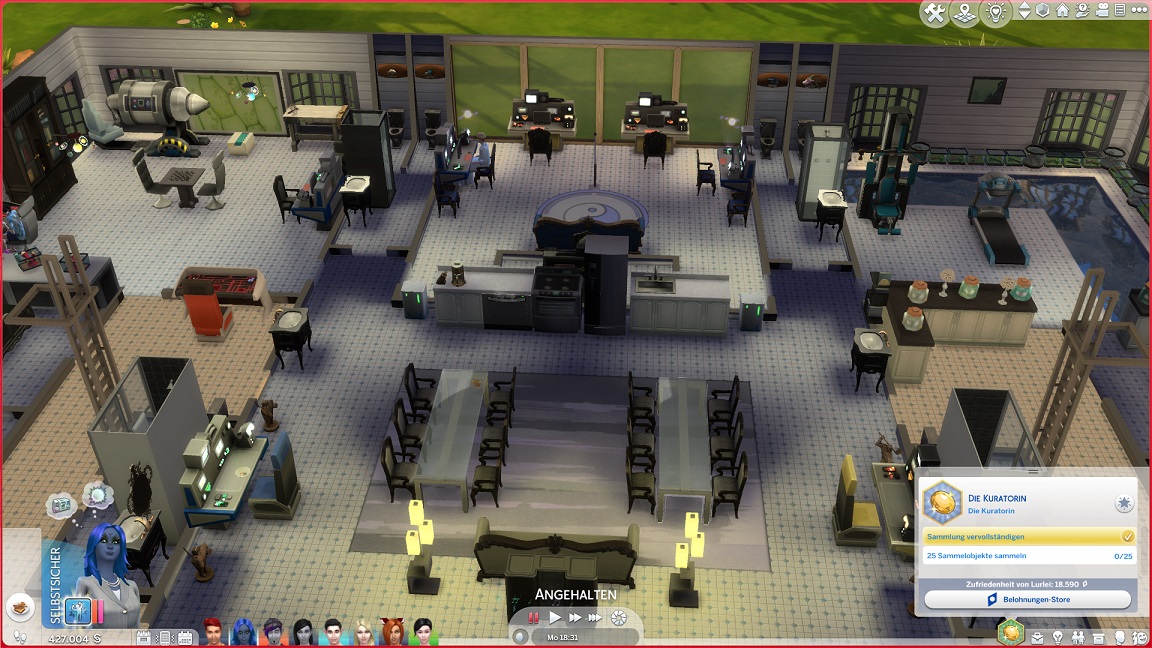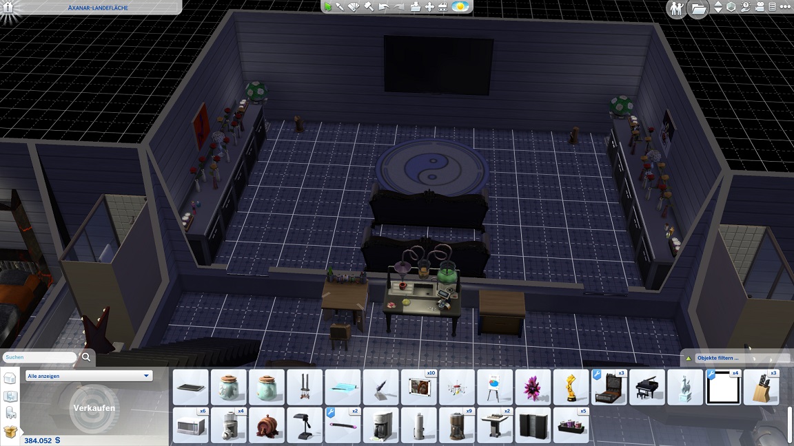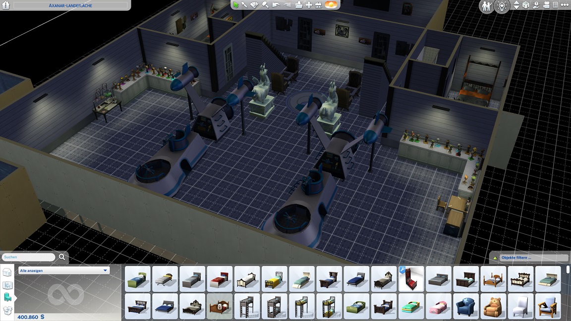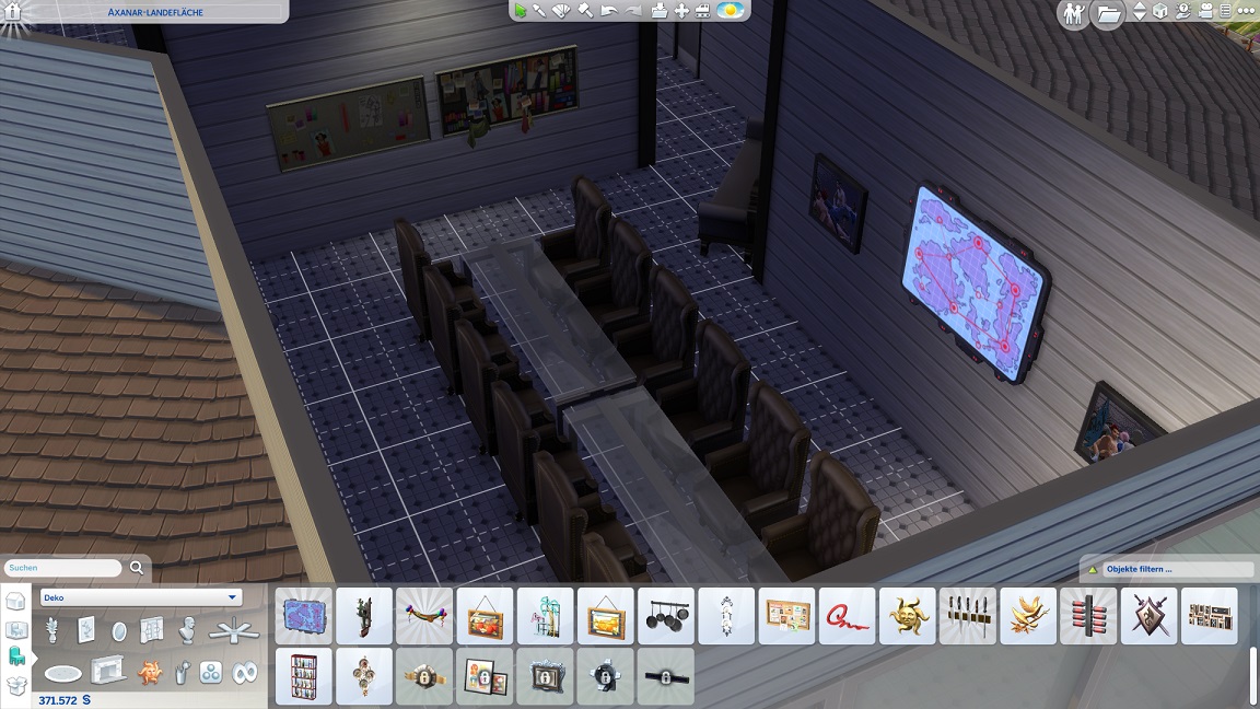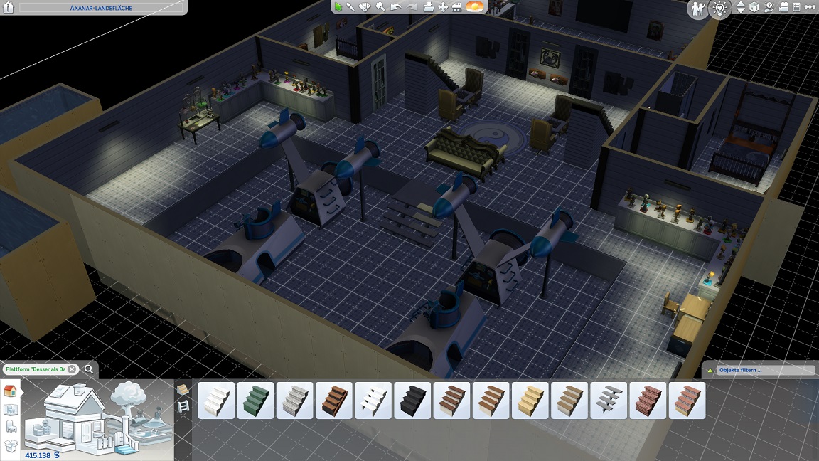So hebe ich das gesamte Unterdeck auf Normalniveau und halte nur die Spiel-Raumjäger auf einem abgesenkten Bereich, der sich zum Glück durch eine Treppe anbinden lässt. Leider entfernt das Verschieben einige Einrichtungsgegenstände, deren Fehlen ich bisweilen nicht sofort bemerke.