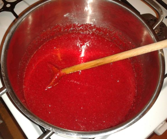 Die Kornelkirschen haben Kerne, daher hab die Früchte zunächst in einem Topf mit ganz wenig Wasser etwas weichgekocht. Dann wird das Ganze durch ein Sieb passiert, damit die Kerne draußen bleiben.