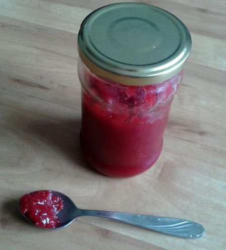 Die Marmelade schmeckt sehr fruchtig und säuerlich. Haps.