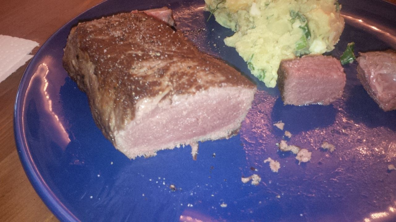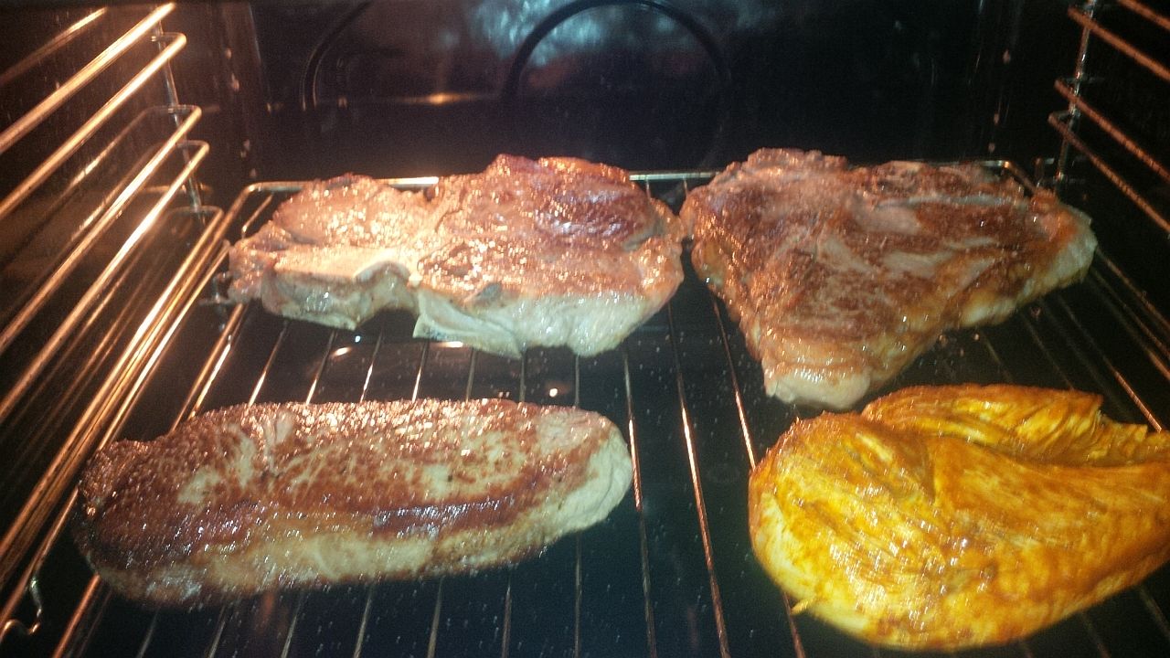 Statt für Rosmarinkartoffeln wurde der Backofen also für Steaks auf 60° genutzt, scharf anbraten, dann ne gute Stunde in den Ofen.