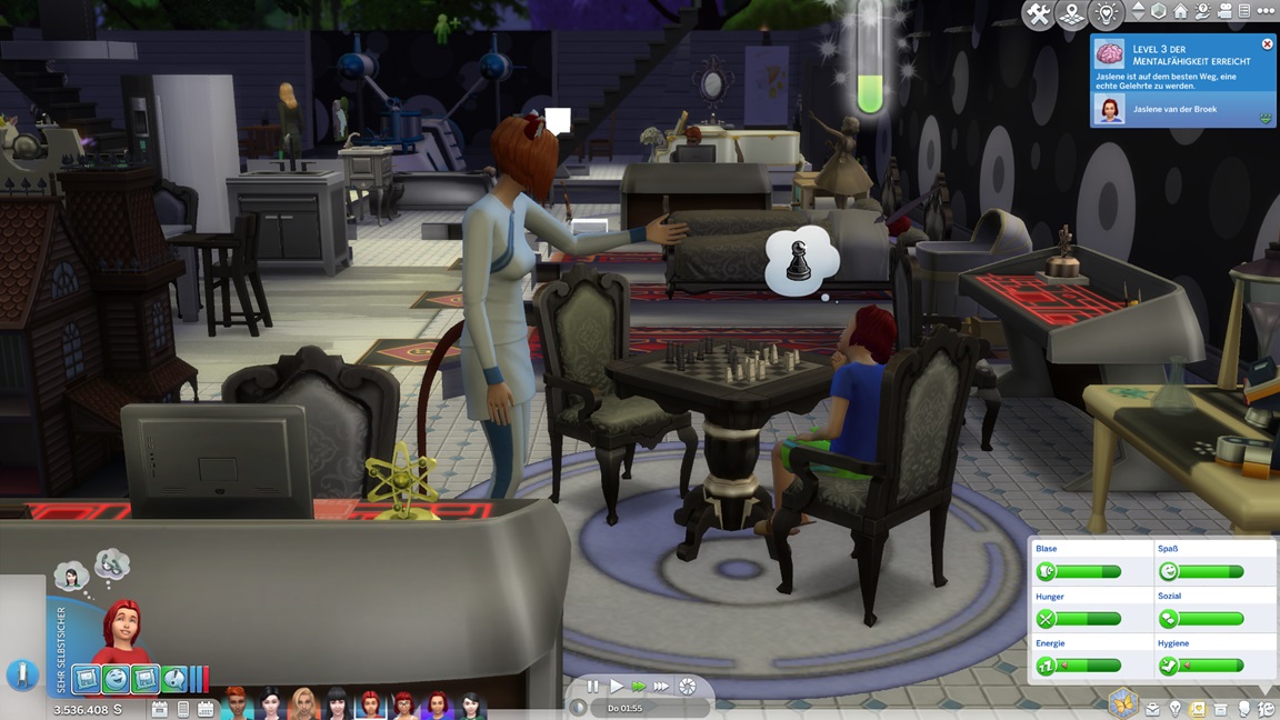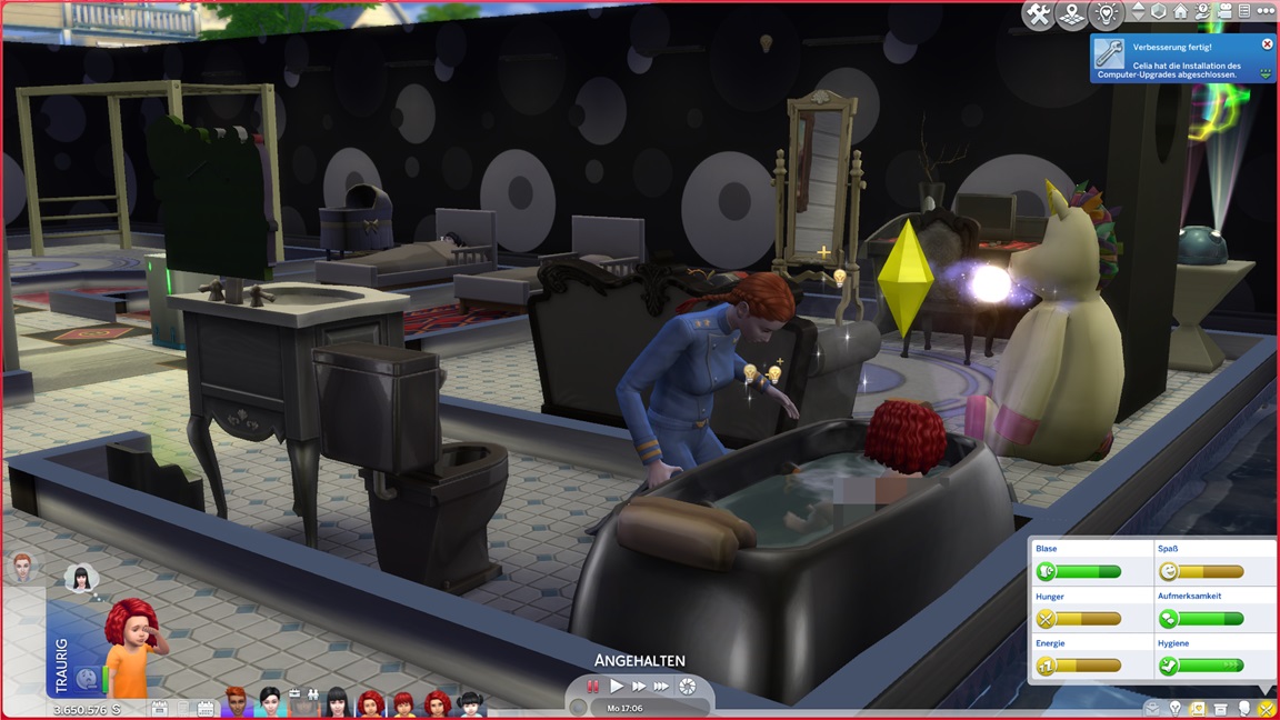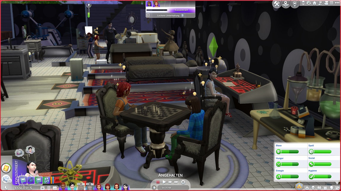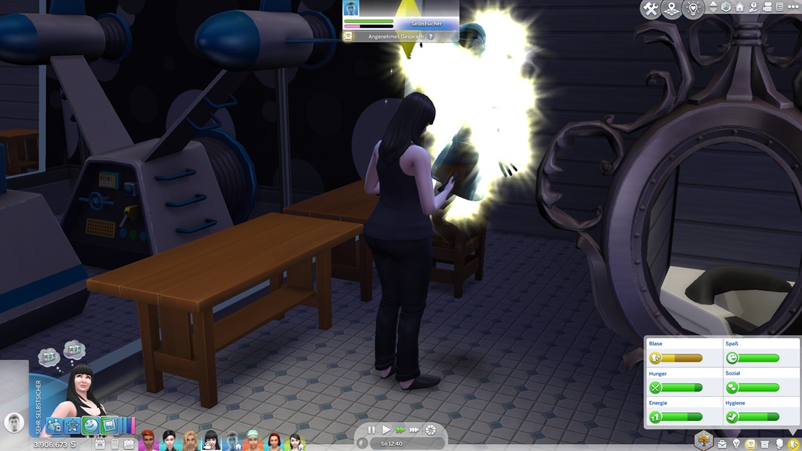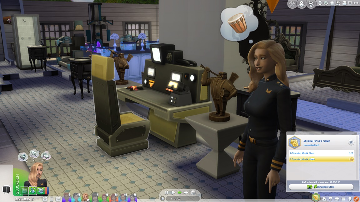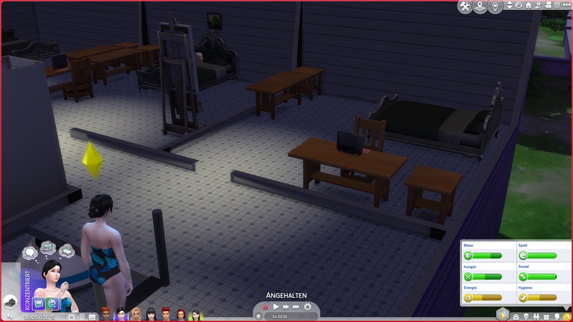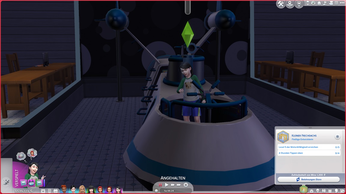 Nachdem Celia die Geräte des unteren Allgemeinbereichs aufrüstete (der Rest bleibt absichtlich für den Moment offen), klemmt sie sich hinter die Werkbank und stattet die Crewkabinen mit Schreibtischen aus, die anschließend noch um Stühle ergänzt werden sollen. Das letzte Kind kann jubeln.