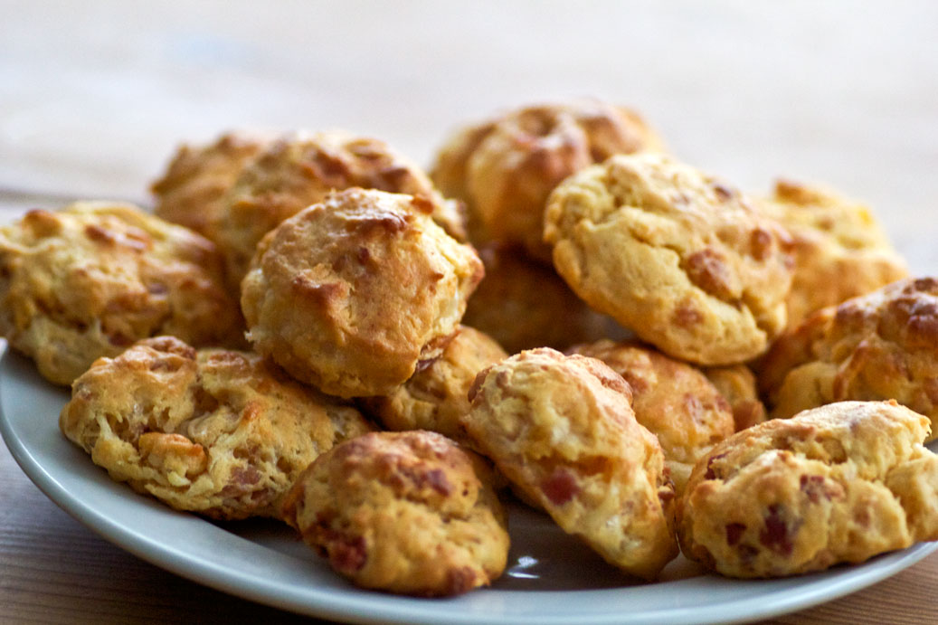 Heute Morgen zum Frühstück gabs Bacon-Cheddar-Biscuits ( minus Cheddar plus anderer Reibekäse ). Sehr zu empfehlen, sind echt lecker. Das Rezept findet man hier . Ganz unten im Kommentar findet man auch die Angaben in Gramm. Gebacken wird bei 220. Bei mir kamen keine 50 raus sondern 28 :gruebel. Hab ich sie wohl zu groß gemacht. Aber eigentlich waren sie grad richtig von der Größe für uns. Die Butter für den Teig sollte unbedingt richtig weich sein. Ich hatte mit der halbweichen Butter echt Mühe sie in den Teig rein zu arbeiten.