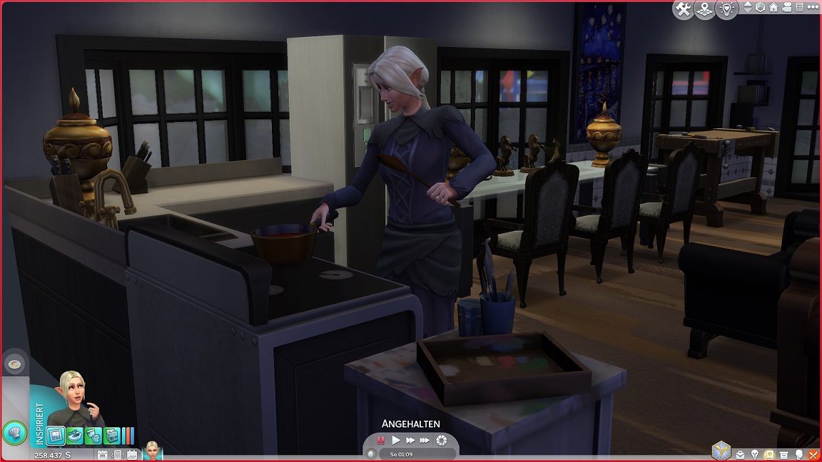 Im Spiel übernahm Vij die "Seelenpartner"-Ambition. Sie heiratete Yui - und erlebte mit, wie sich diese auf dem ersten Date nach der Ehe so sehr amüsierte, dass ihr Herz aussetzte und sie starb. So blieb sie allein in dem Haus zurück und versuchte sich ganz elfisch mit dem Gärtnern, doch auch wenn sie sich besser schlug als Telys, kam ich damit nicht zurecht.