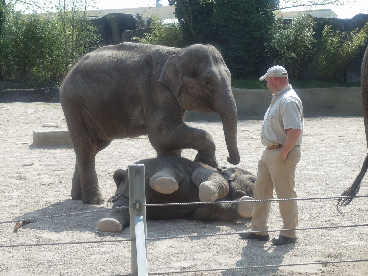 Zwei Jungfanten spielen während die Älteren alle damit beschäftigt sind Futter von den Zuschauern zu errüsseln.