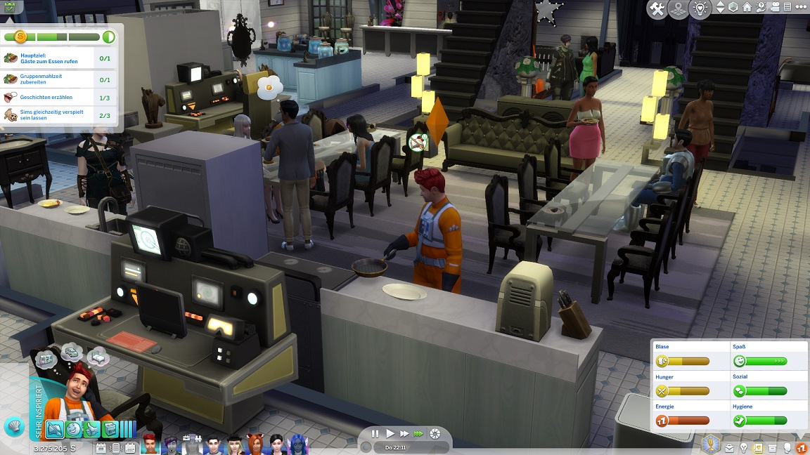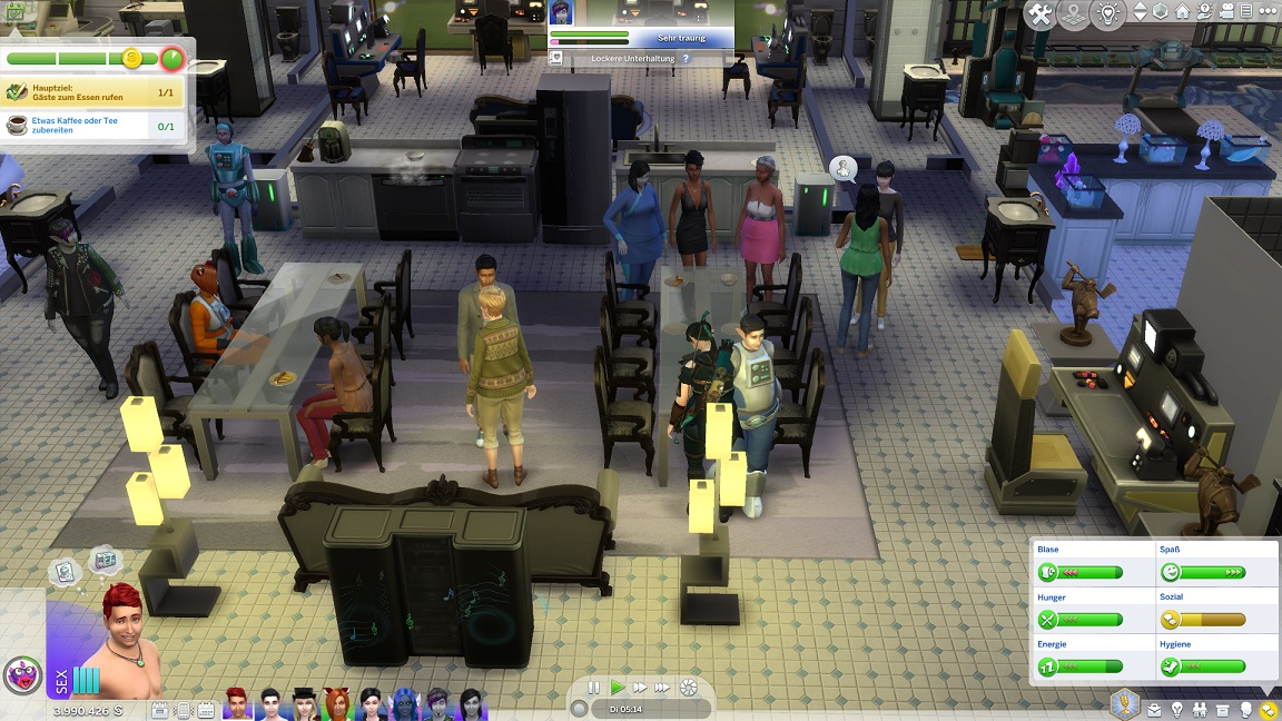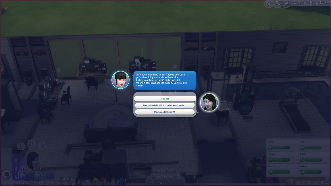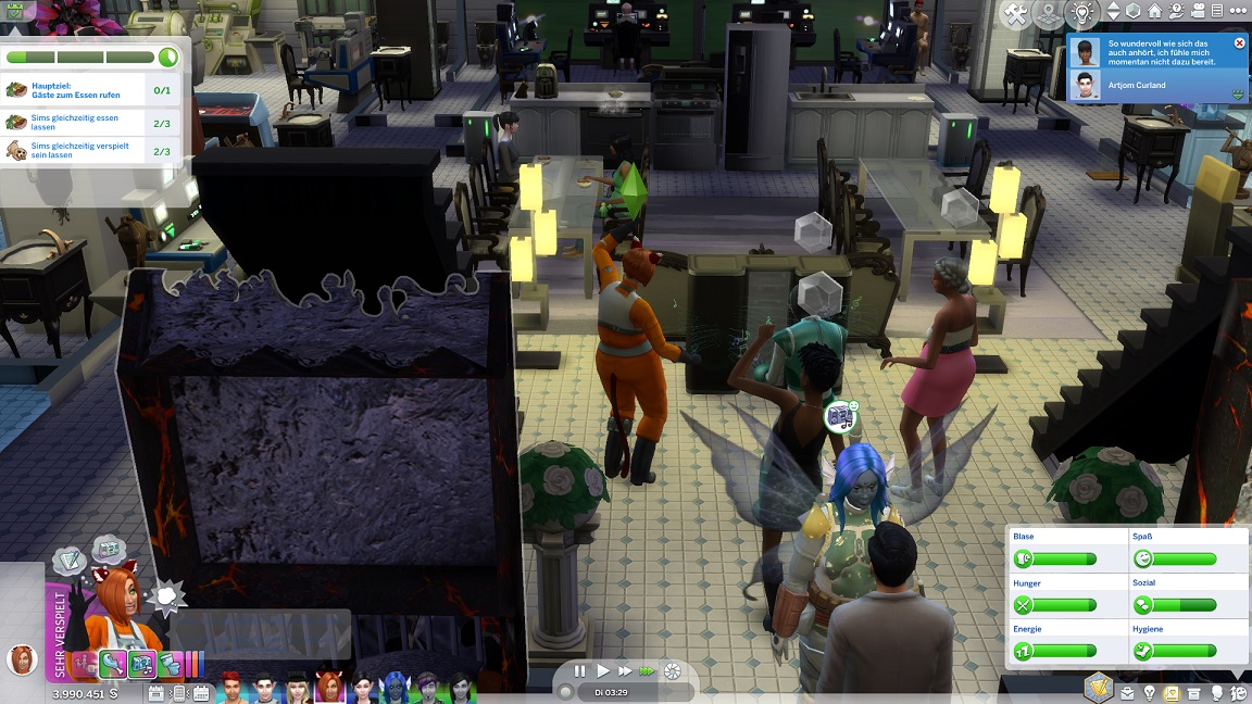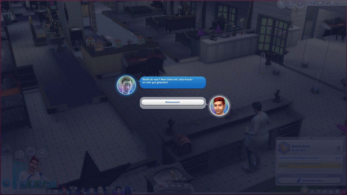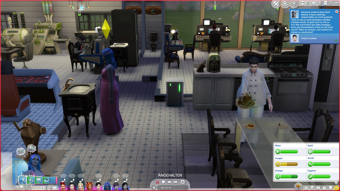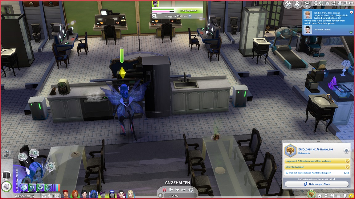 Artjom lädt einige von Renas Kindern zu sich ein, da er herausfinden möchte, ob er verkuppelte Sims in Richtung Verlobung schicken kann (soviel ich weiß, geht es tatsächlich nicht). Natürlich spricht er auch ein Kompliment über ihre Garderobe aus.