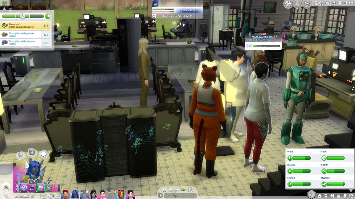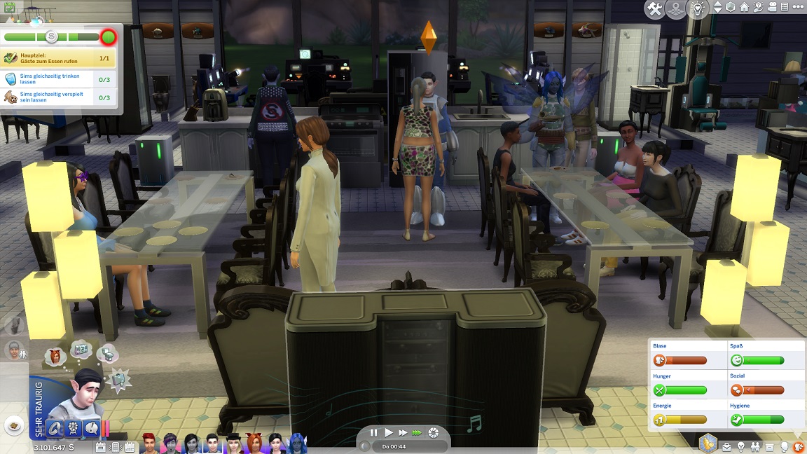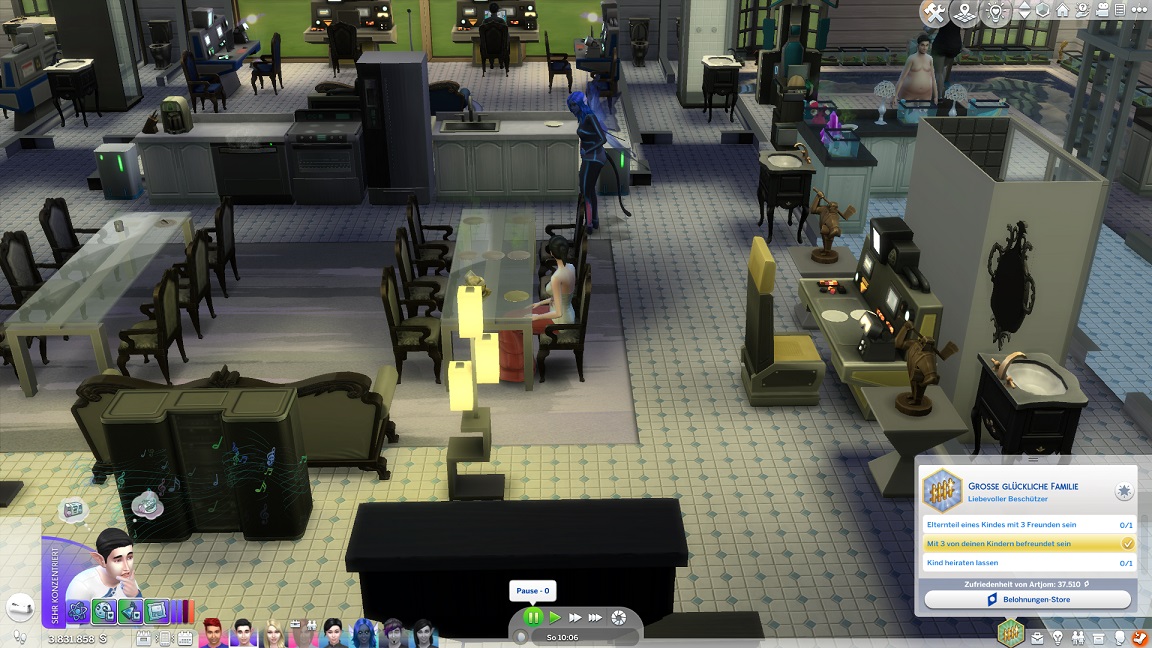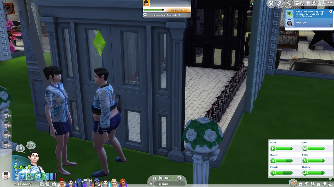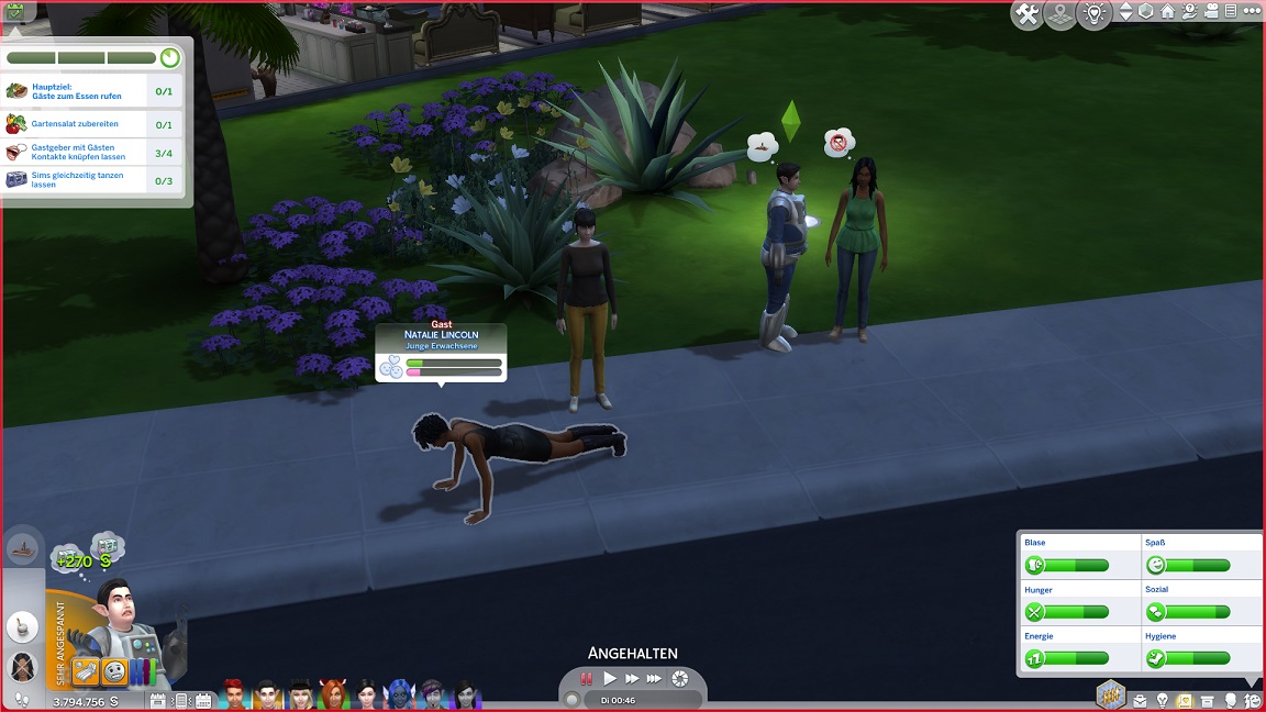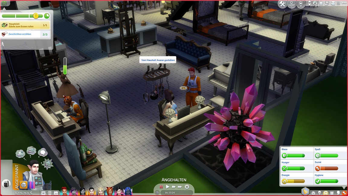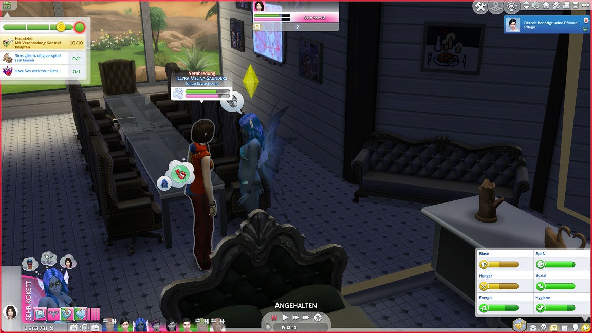 Artjom lädt einige von Renas Kindern zu sich ein, da er herausfinden möchte, ob er verkuppelte Sims in Richtung Verlobung schicken kann (soviel ich weiß, geht es tatsächlich nicht). Natürlich spricht er auch ein Kompliment über ihre Garderobe aus.