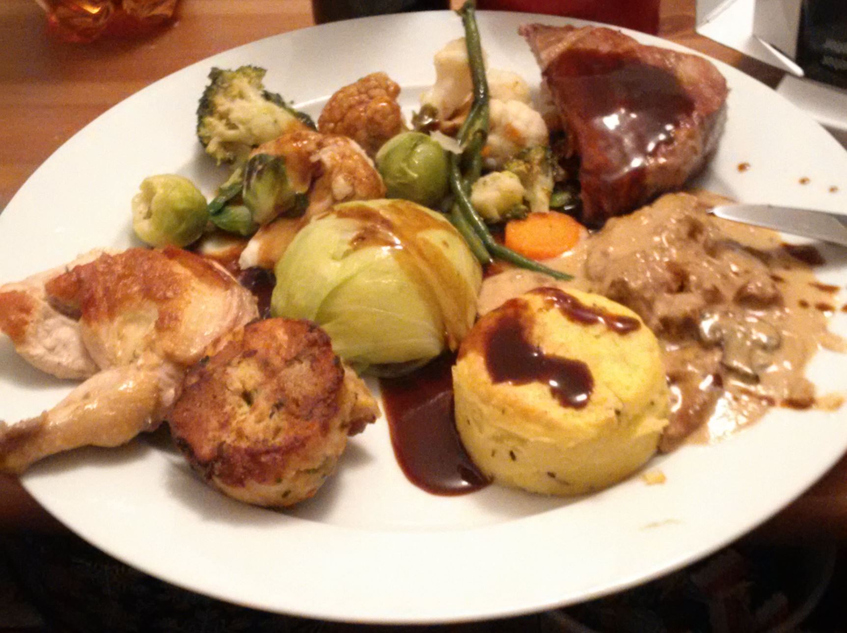 Maispoularde, Durocschwein, Kalbsragout, Mais-Trüffel-Törtchen, gemischtes Gemüse, Kohl-Trüffel-Praline und Serviettenknödel. Fasan und geschmortes Rind sind nicht im Bild, die musste ich in der 2. Runde probieren.