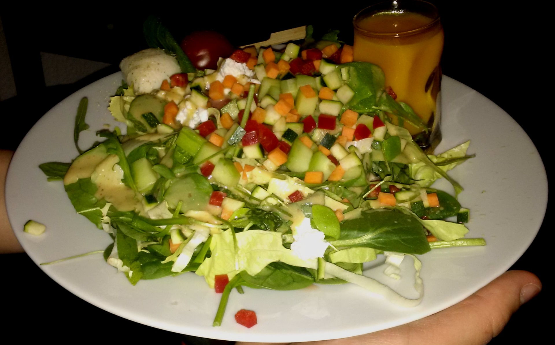 Gemischter Salatteller mit 18 Salat- und Kräutersorten und Ziegenfrischkäse, dazu ein Amuse-Bouche aus Kürbis-Möhrensuppe und ein Tomate/Mozarella-Spieß.