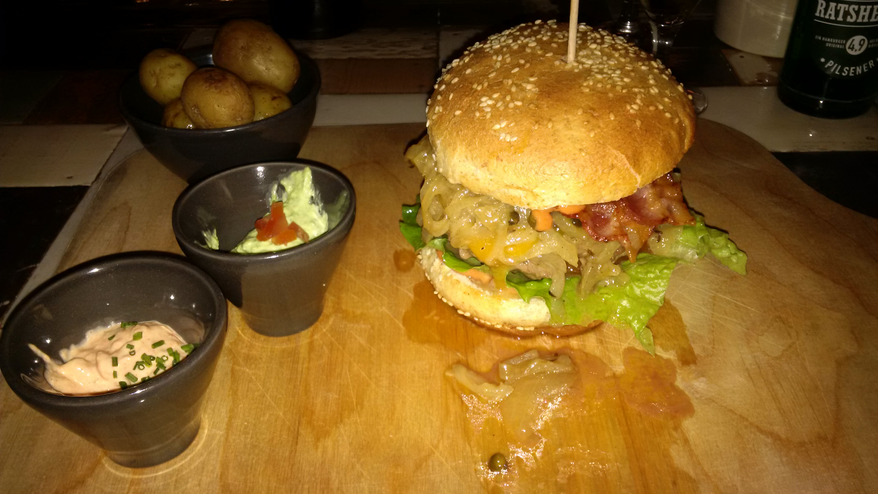 Mit Gubbel und Dellaway waren wir heute im Diner der Bullerei, es gab meinen neuen Lieblingsburger - mit Pefferzwiebeln, Bacon, Doppelt Käse und Räucherkartoffeln.
