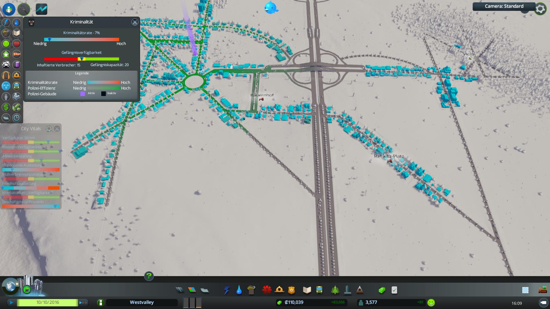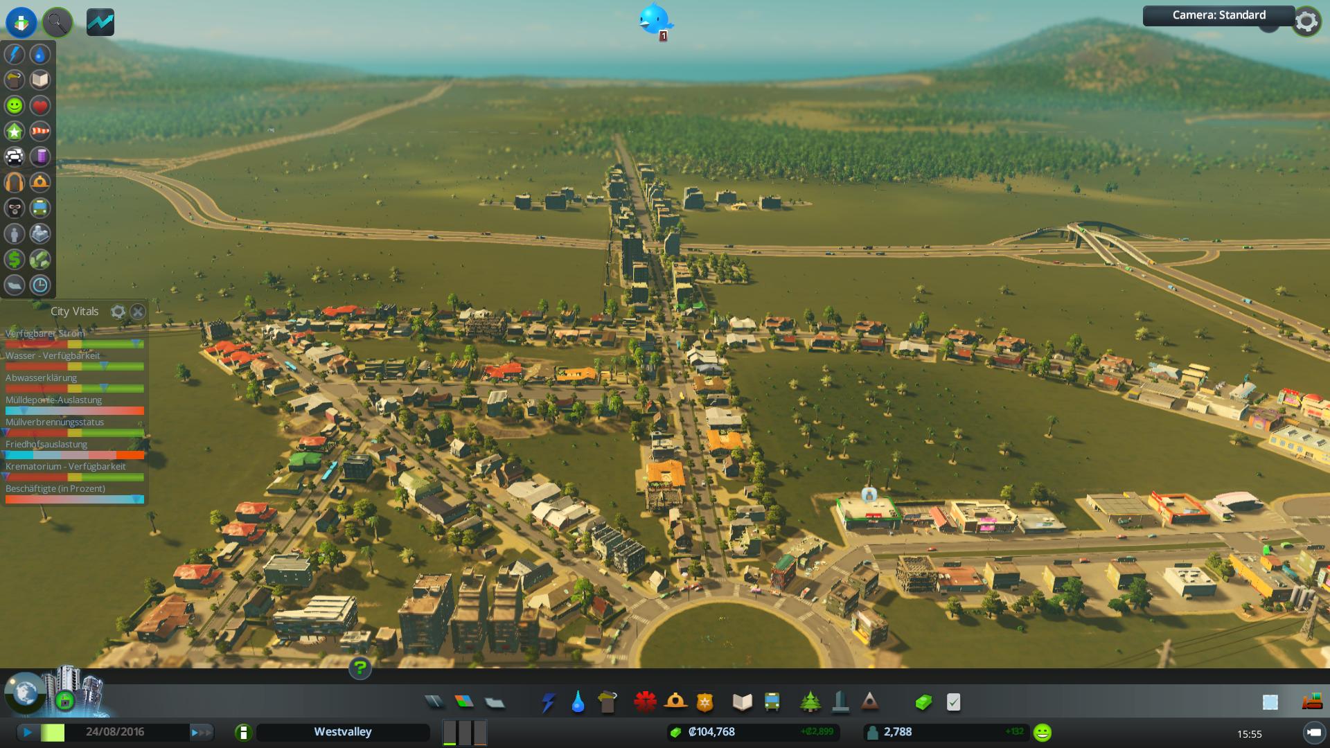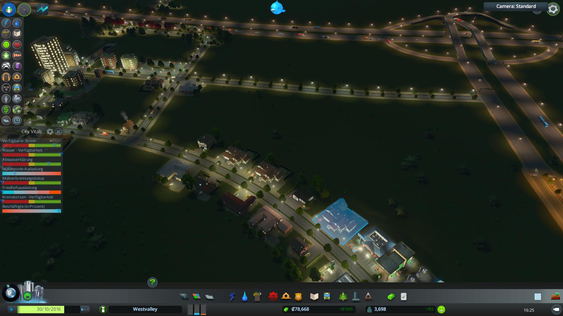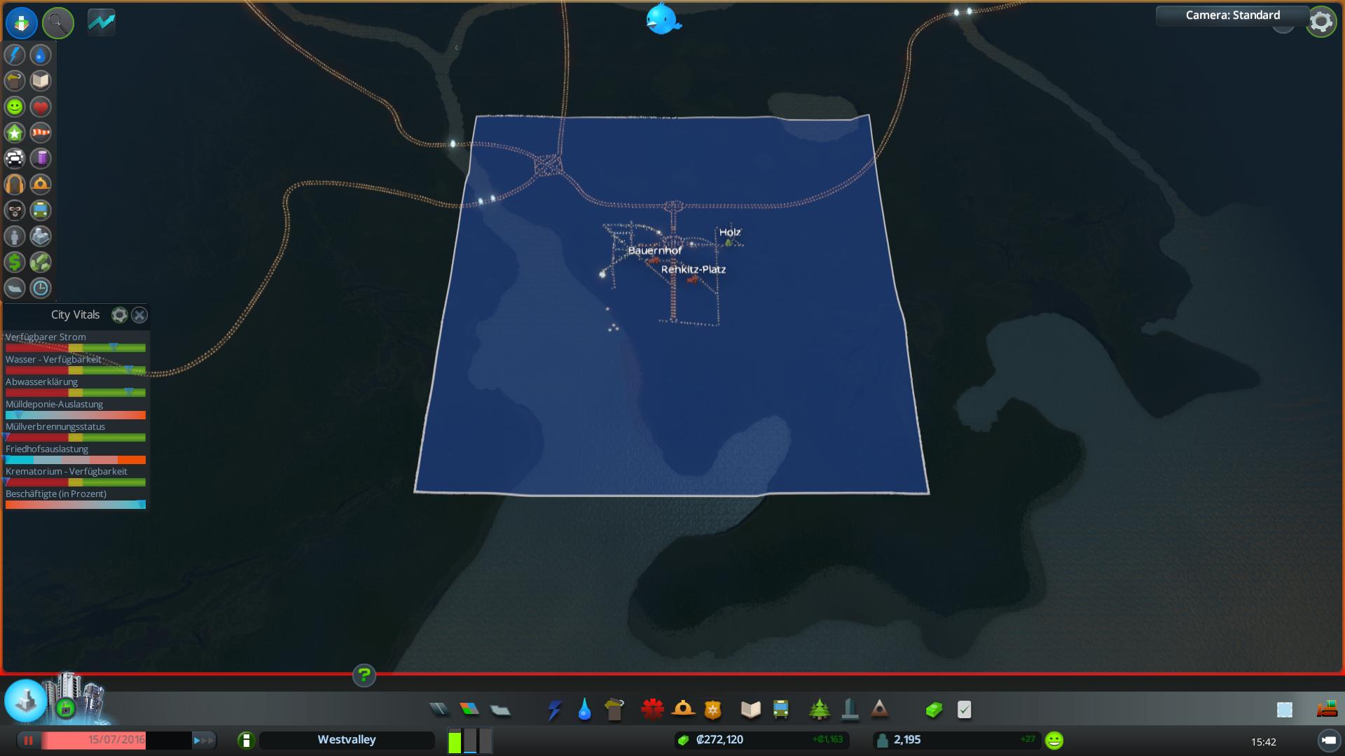 Durch die Erweiterung der Welt, kann ich jetzt meine Stadt links erweitern. Schöne Straße Richtung Fluss hingepflanzt und leichtes Wohngebiet ausgegeben. Hier sollten dann nette kleine Villen entstehen. Unter Umständen muss ich hier noch mit Verordnungen eingreifen um arme Bewohner fern zu halten, aber dazu später mal mehr.